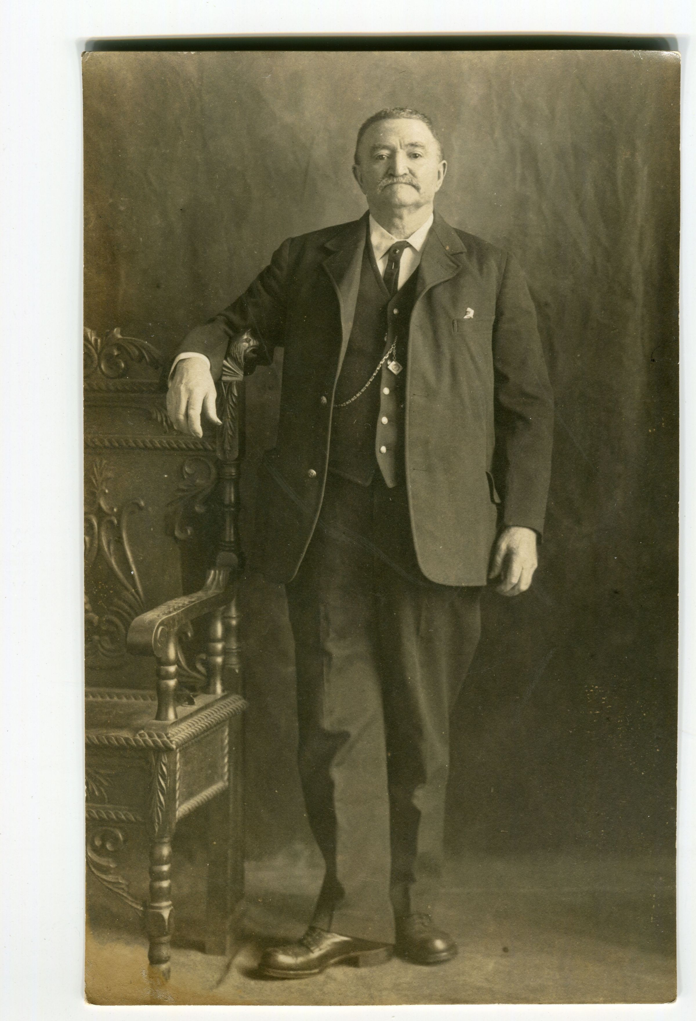 Studio portrait of man in late middle age. He wears a dark suit with waistcoat and watchchain. Identified on the back as Frank De Bie Belgmen.