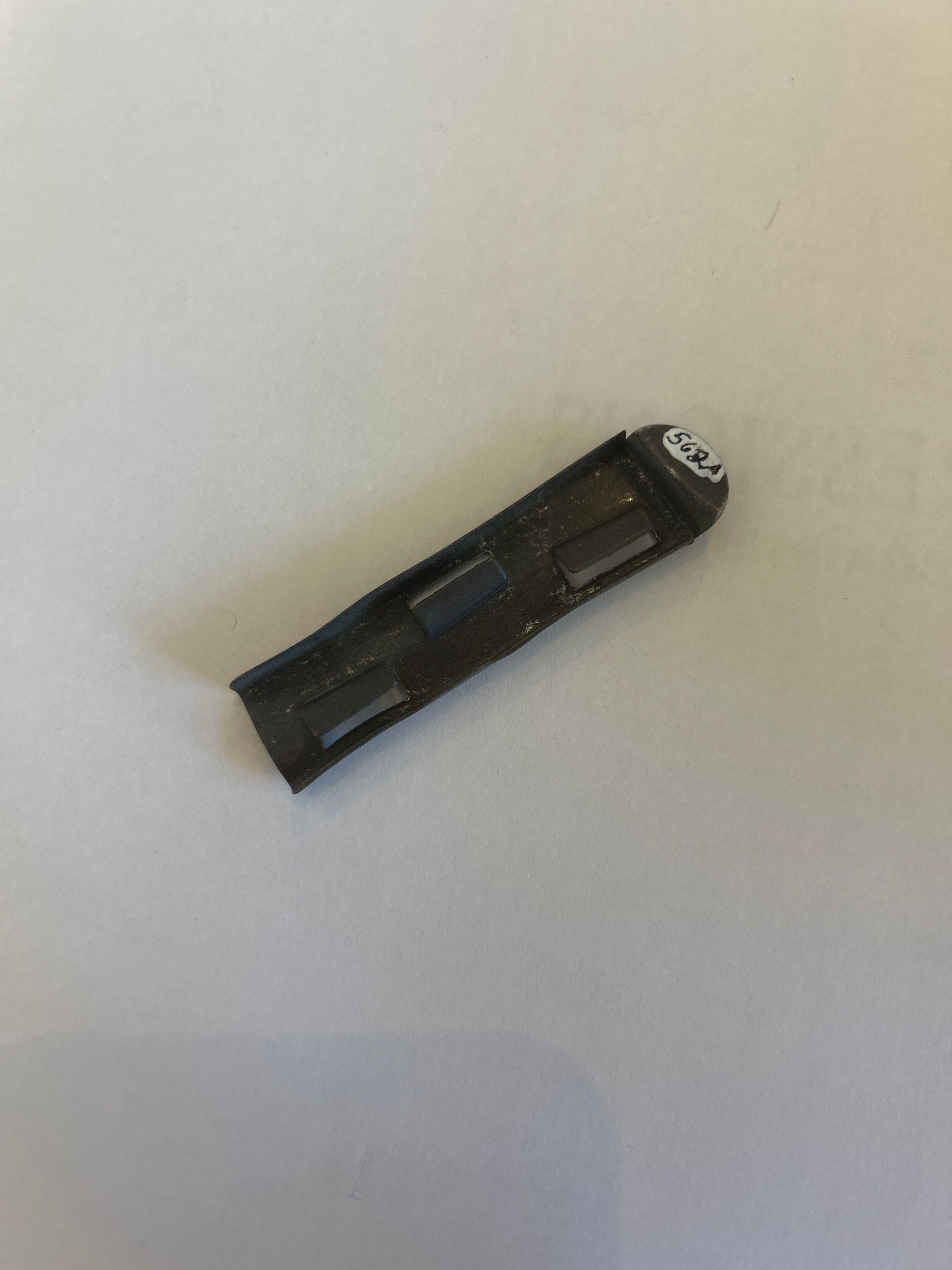 Metal piece 2 1/4 inches long, 5/8 inch wide, 3/16 inch high. One end has a curved flange that extends 1/2 inch. The tie with two others connect the tracks together.