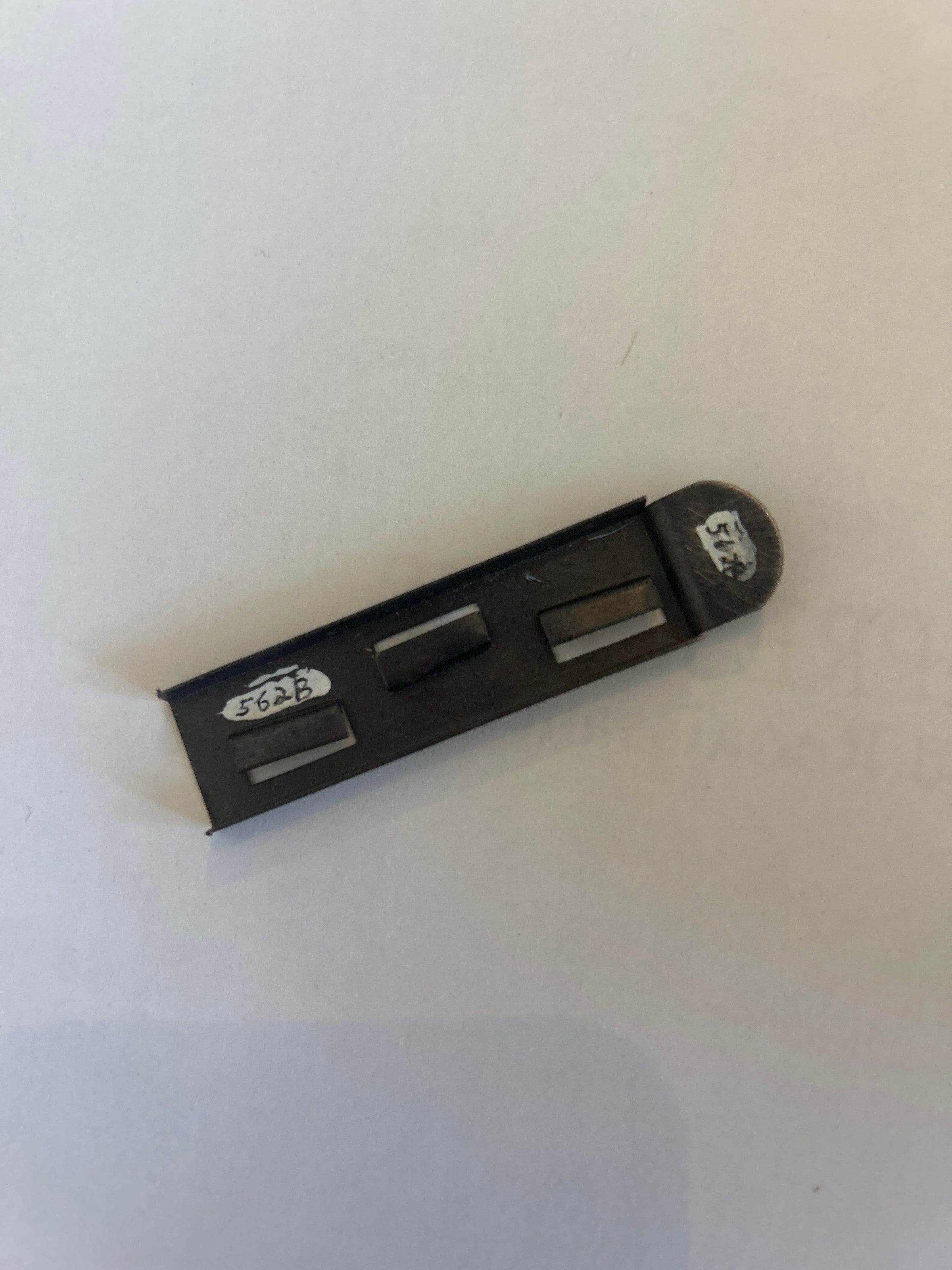 Metal piece 2 1/4 inches long, 5/8 inch wide, 3/16 inch high. One end has a curved flange that extends 1/2 inch. The tie with two others connect the tracks together.