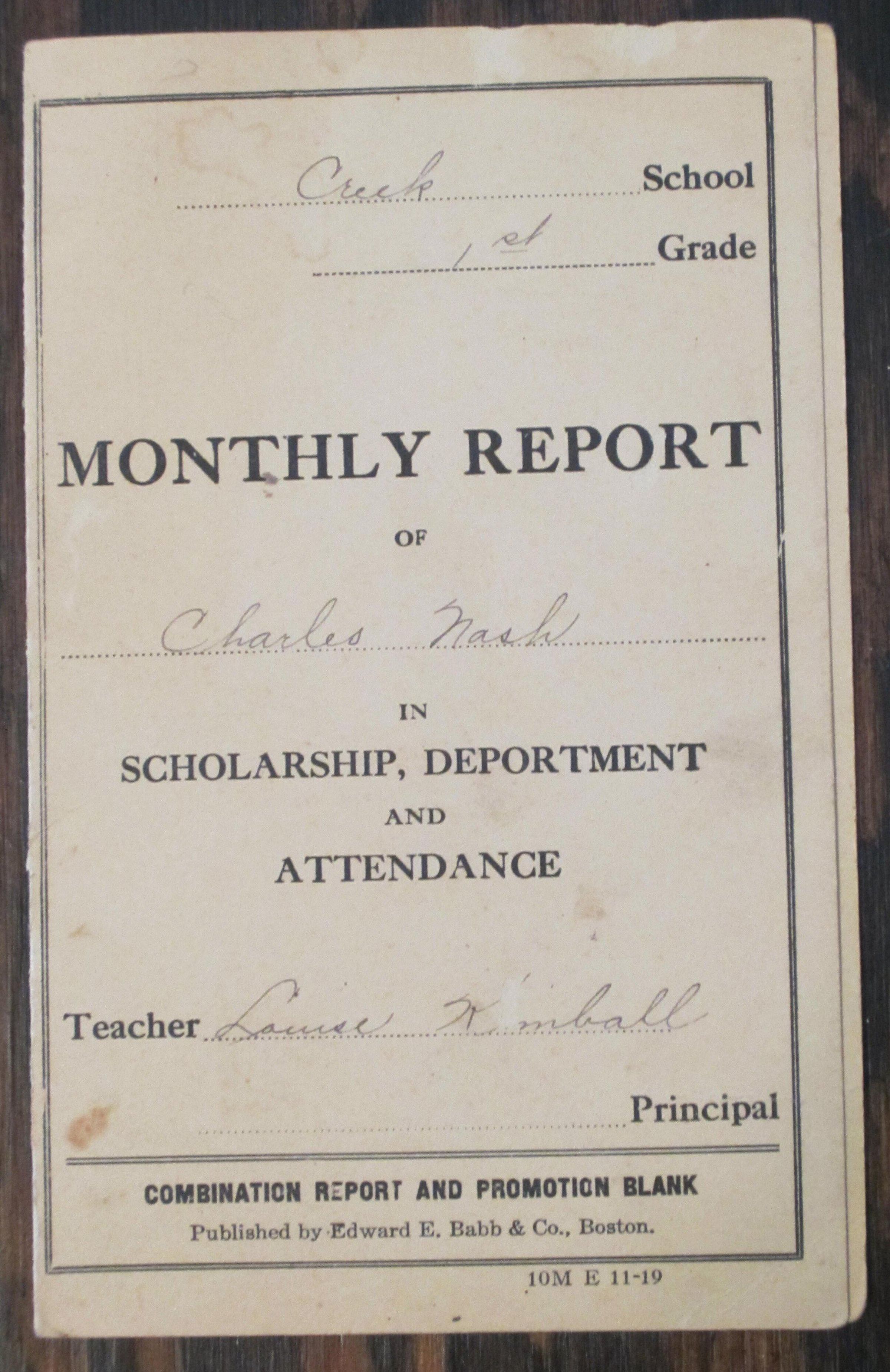 Report Card for Charles Nash from Louise Kimball, Principal of the Creek School, for Charles in 1st grade, signed by parent Celia Nash for February, March, April of 1922. Grades are given for Reading, Penmanship, Arithmetic, plus data on days of school (15,20,20), days present (12,18,20), days prompt (all but one), Deportment (100), and No. pupils in class (2).