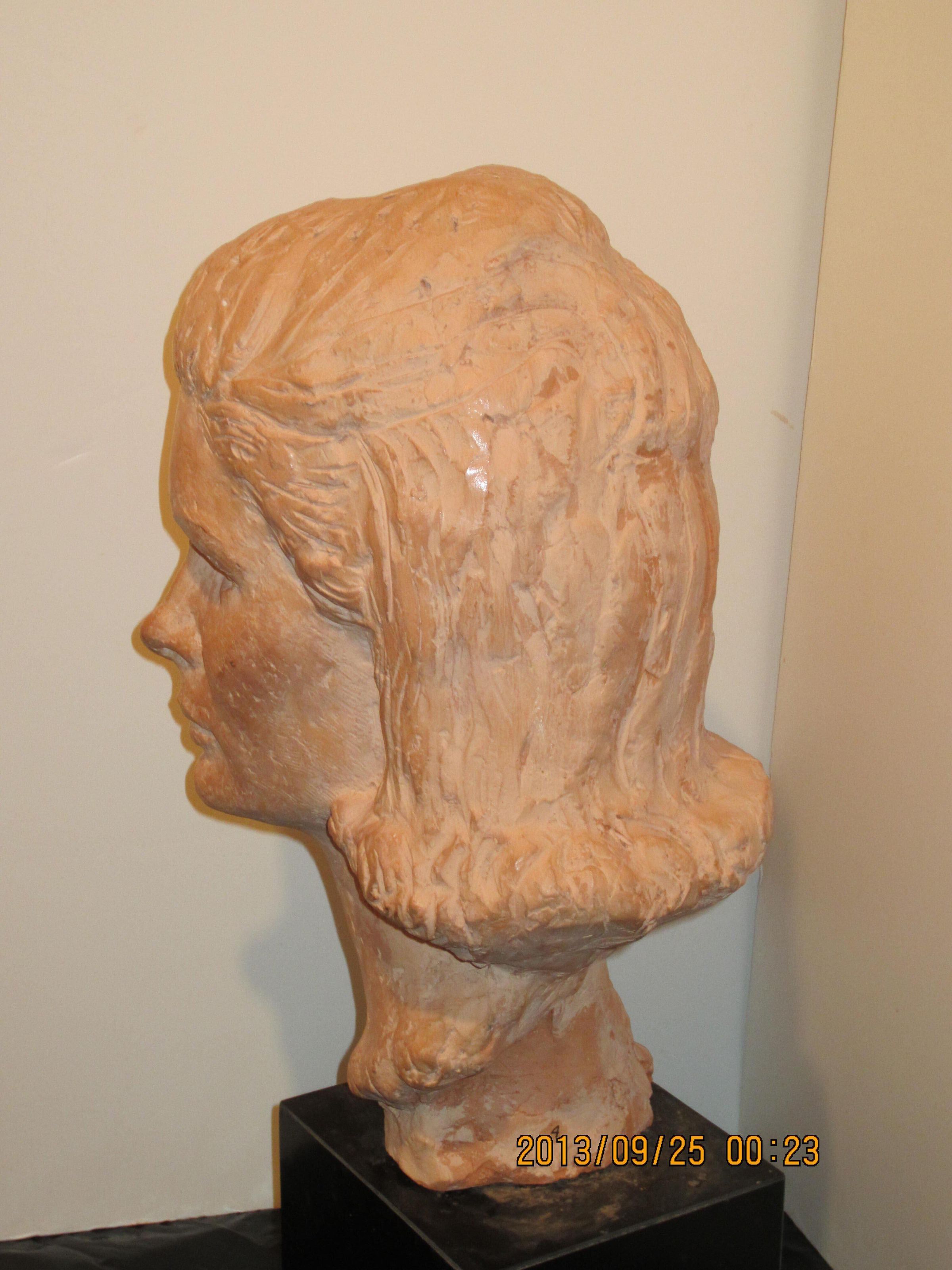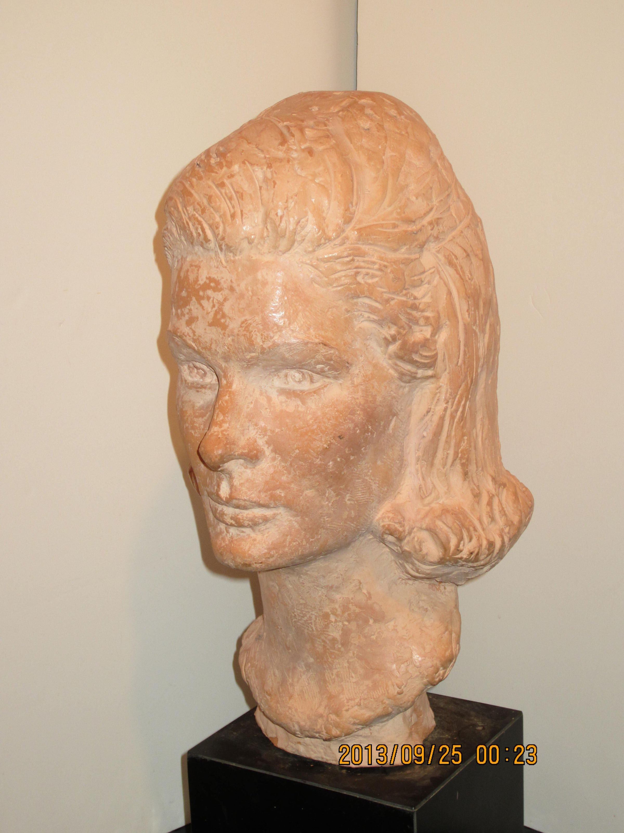 Sculptured head made of clay, baked, soft rose color. Height of sculpture including base - 22 1/4 inches, diameter of head approx. 23 inches.