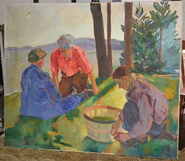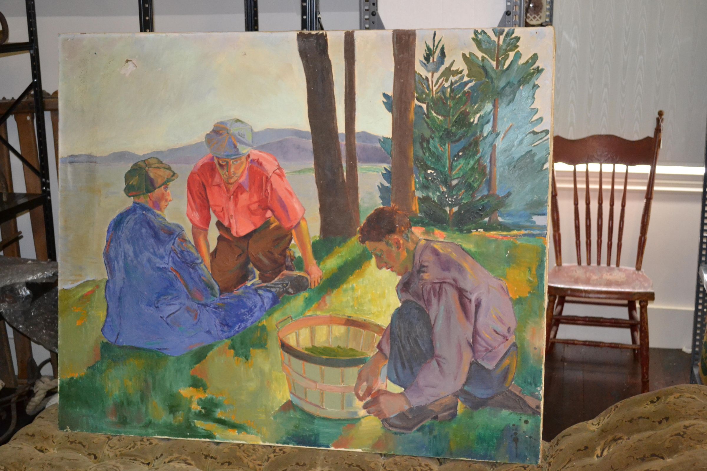 Unframed oil painting on canvas measuring 40 inches x 48 inches. Picture shows three men, one seated, two kneeling, on shore of Penobscot Bay, showing Camden Hills in distance. Canvas is torn in upper left corner.