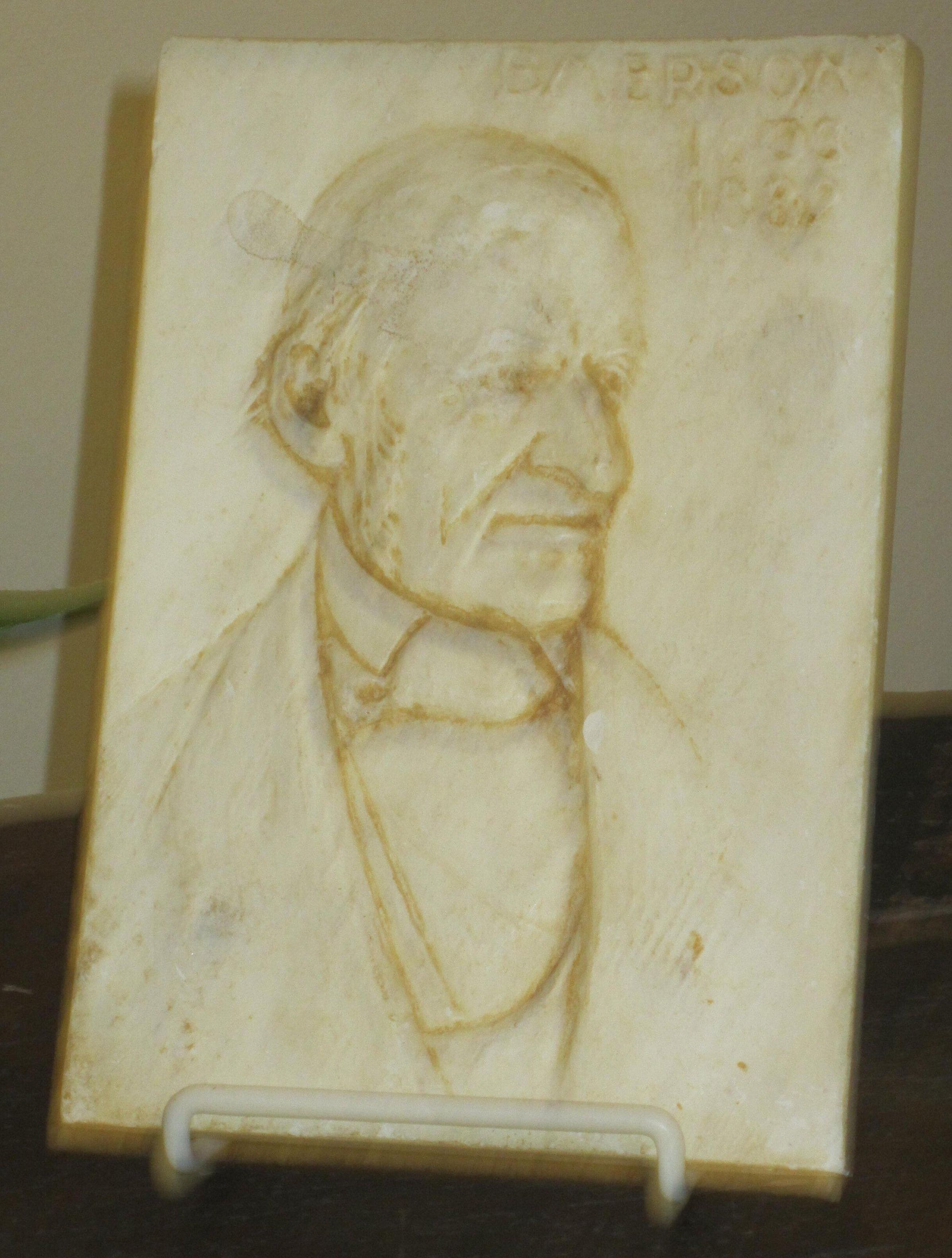 7 1/2 inches x 5 1/4 inches x 1/2 inch. Plaster plaque bust relief of Ralph Waldo Emerson. Has 2 small round metal hooks on back.
