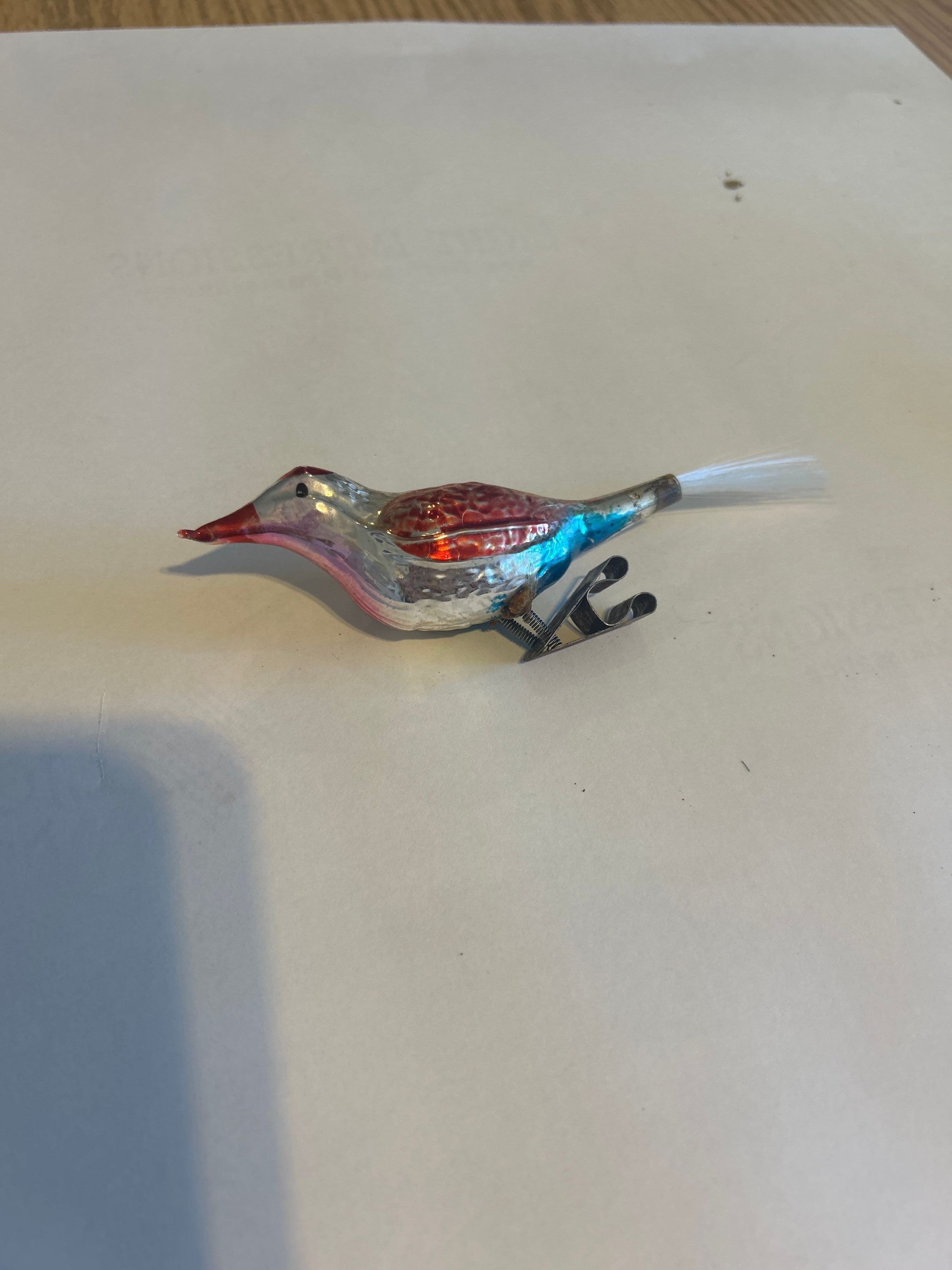 6 inches x 2 inches x 1 1/8 inches. Silver bird has red head, beak and wings with blue underbody. Two springs attach bird to metal spring clip.
