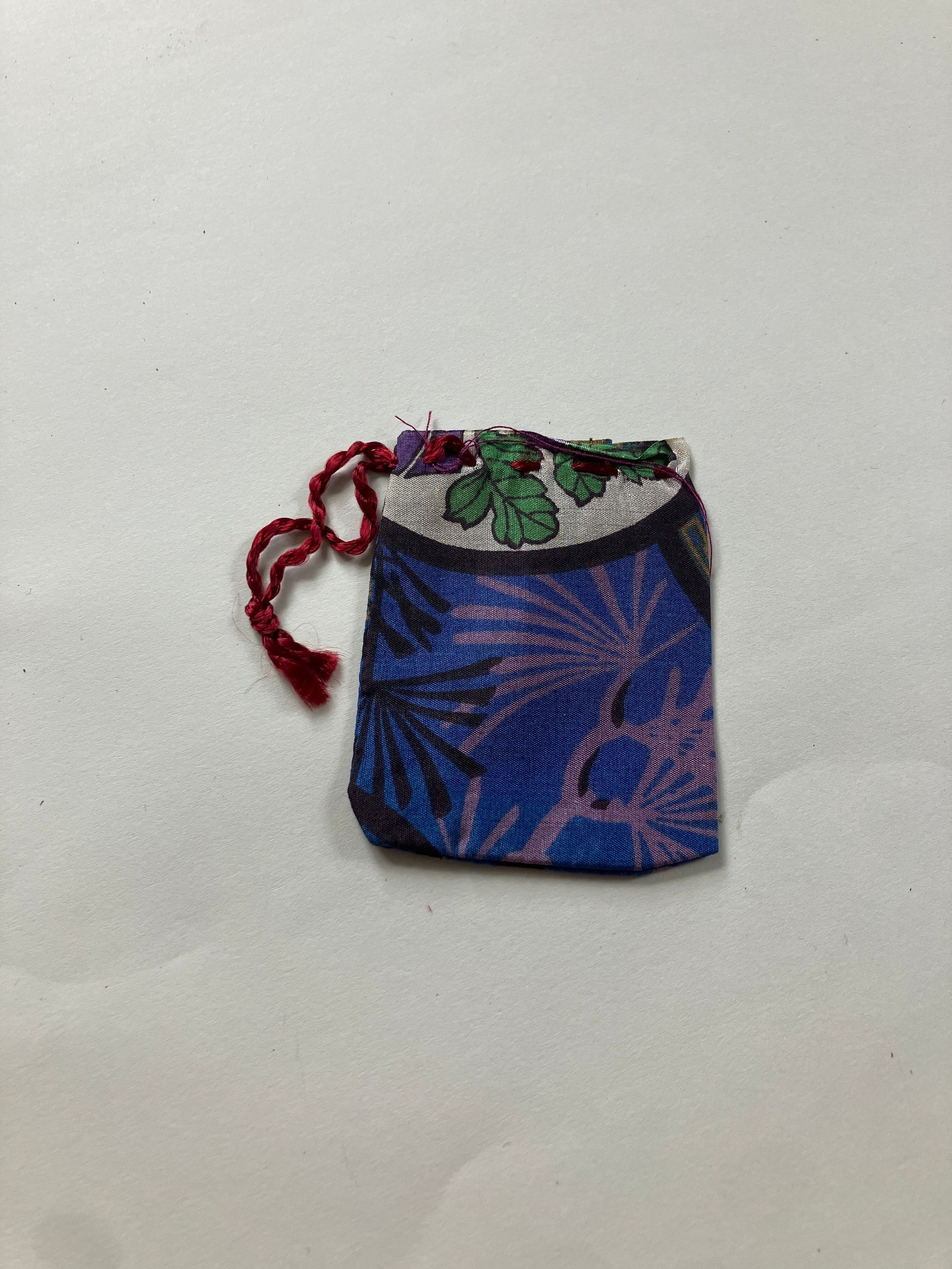 Small piece of cloth, sewn together leaving one end open. Bag is 2 1/4 inches x 2 3/4 inches in size. Drawstring of maroon thread closes the bag.