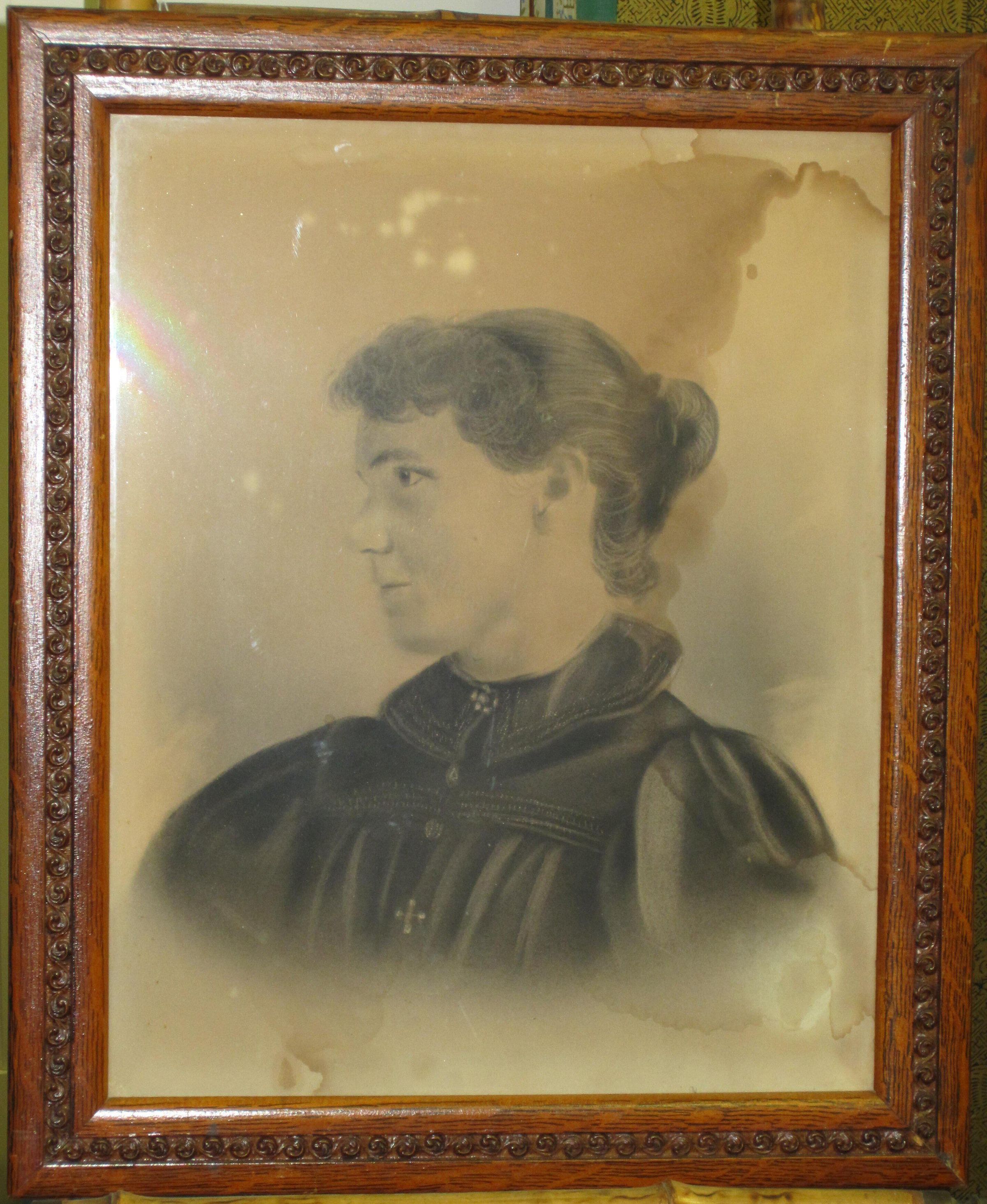 Framed portrait 19 1/2 inches x 23 1/4 inches. Brown wooden frame with a carved scroll pattern 1/2 inch wide extending through the middle of the frame, unmatted. Portrait is dark gray and "white", occupies center with no background.