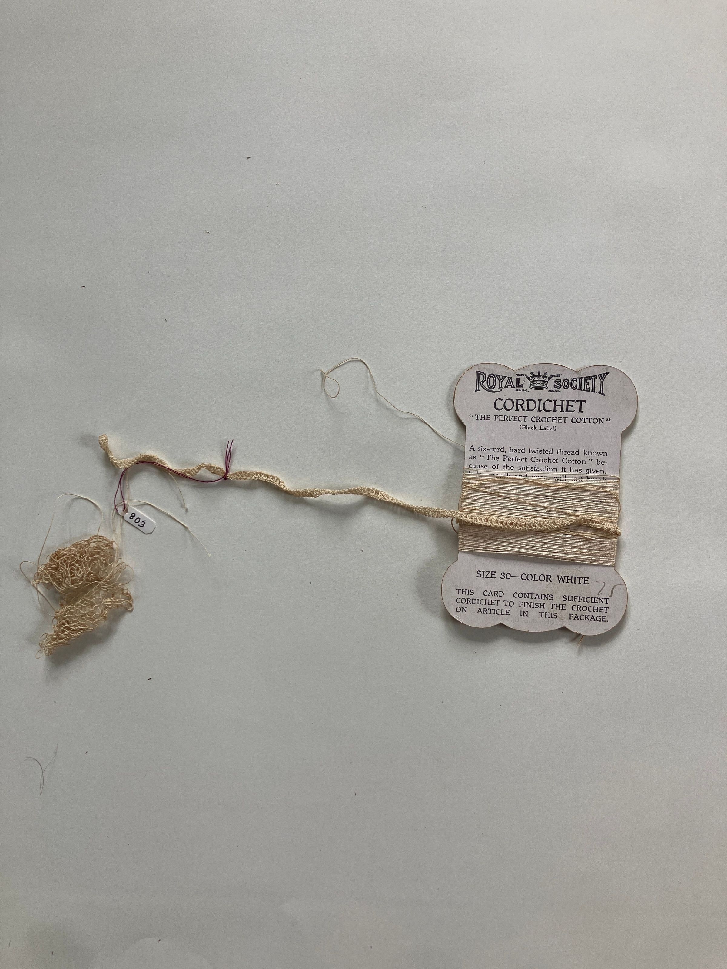 Ecru cotton thread, size 30, wound on a card. This was part of a package with material and directions for making a crocheted item. The directions are missing and much of the thread also. Part of the thread has been crocheted and is also wound around the card. A second piece has been worked in netting technique.