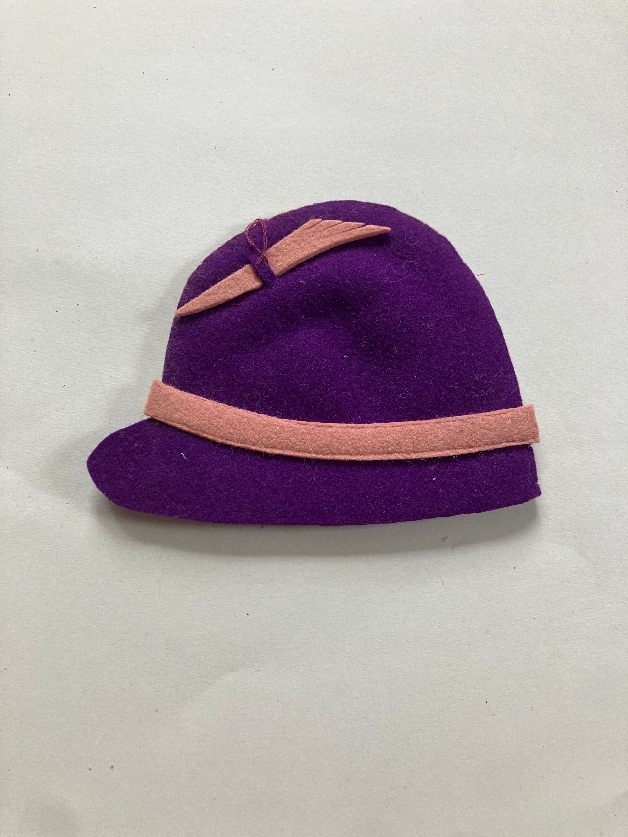 Flat purple felt piece approximately 4 inches or 3 1/2 inches x 3 1/2 inches in the shape of a hat with a visor (side view). Pink felt feather near crown of hat, pink band above the visor. Gray flannel is sewn on the reverse side and is open at the bottom.
