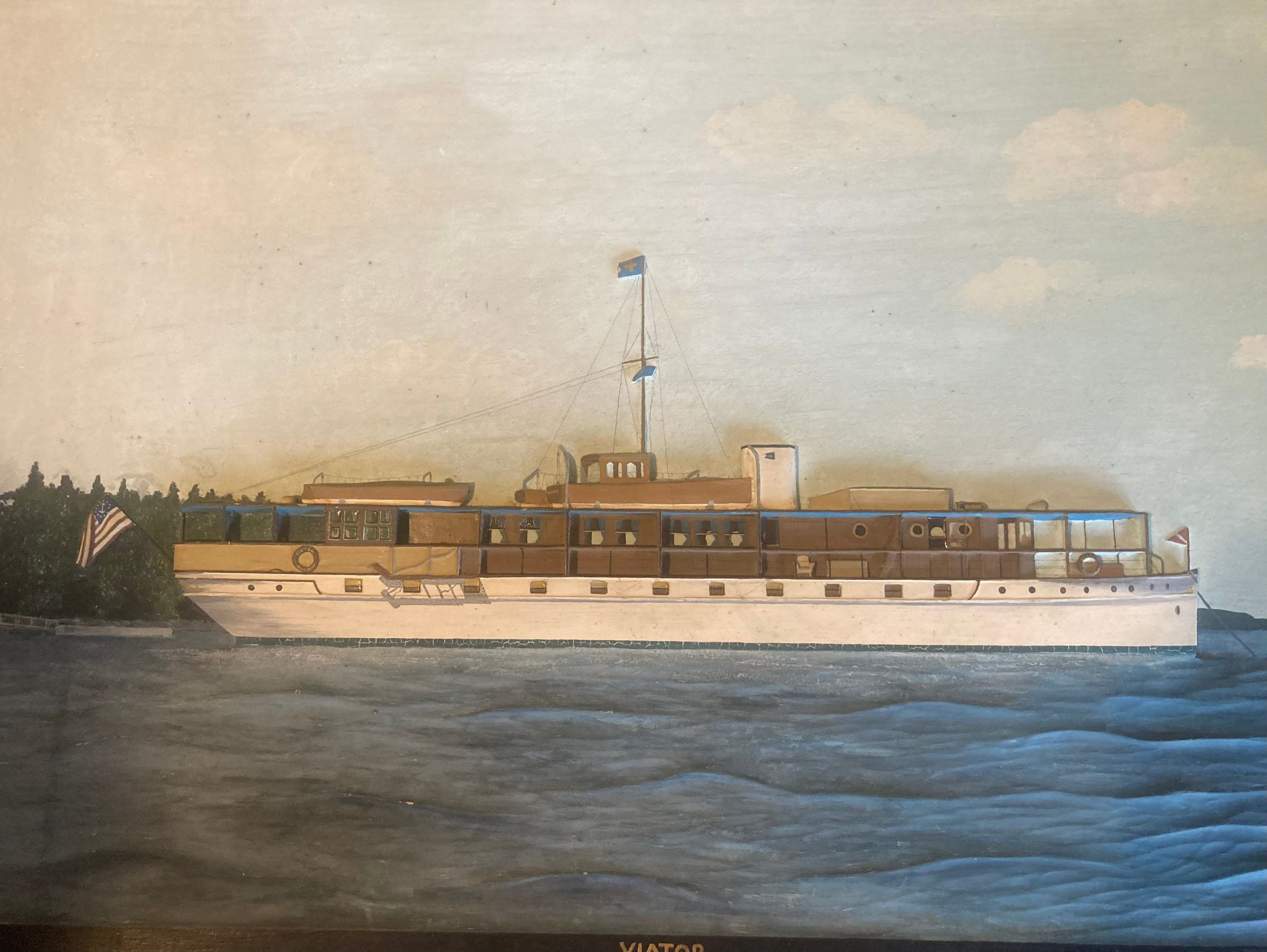 The picture has been carved out of one piece of wood. The frame is also part of the carving. Frame, 25 inches x 19 1/2 inches x 1 inch. Gold stripe around inside edge of frame. Frame painted black, 1/4 inch around 3 edges of frame and 1 inch at the bottom of the frame, with the inscription, "Viator Owned by Dr. M. A. Alexander Islesboro Maine". Painting consists of a background of water, some trees, and sky. In the foreground is an anchored gasoline launch and some of the water in bas relief. The launch is 15 1/2 inches in length and