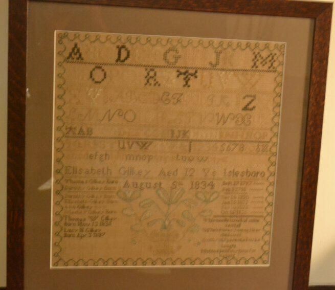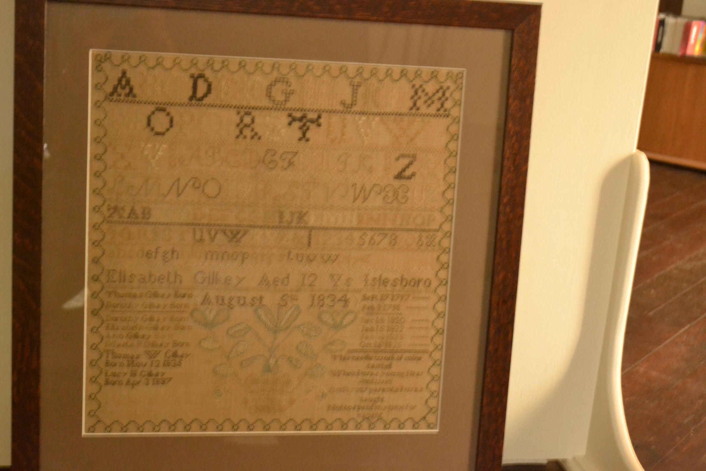 Sampler contains cross-stitched thread of white, shades of brown and green, making up designs, letters, and numbers on burlap. Top part of sampler contains cross-stitched alphabet and numbers 1 through 9. The bottom half contains names of the parents of siblings of the Elizabeth Gilkey family with birth dates - see "People" tab. Sampler frame measures 18 1/4 inches x 17 3/4 inches (outside), 16 3/4 inches x 17 1/4 inches. Frame backed but parts of backing are torn.