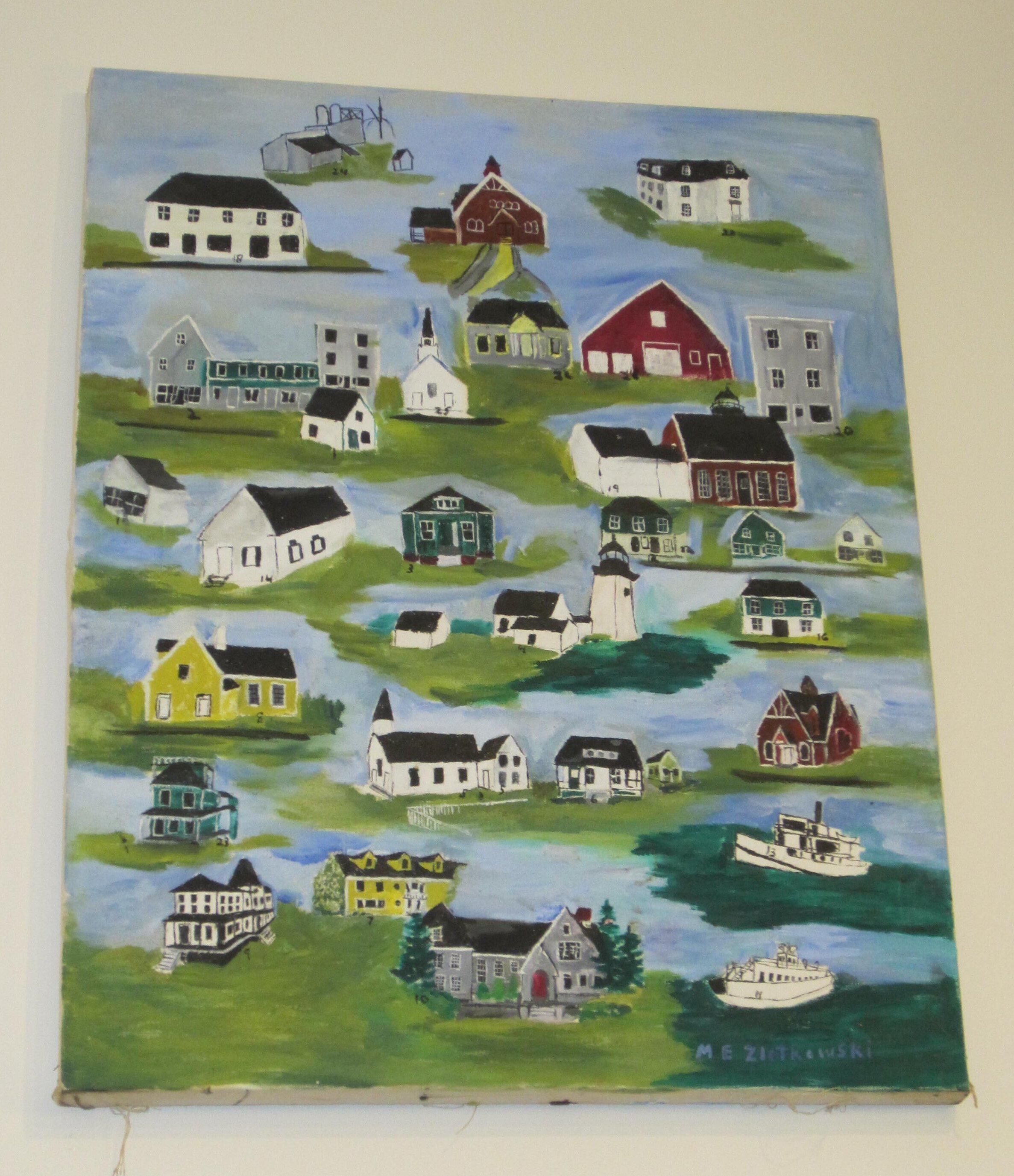 Painting, oil on canvas, unframed. Depicts historical buildings and boats of Islesboro, each of which is numbered, although corresponding information has not been found. Signed "M E Zlotkowski" aka Malcolm Zlotkowski