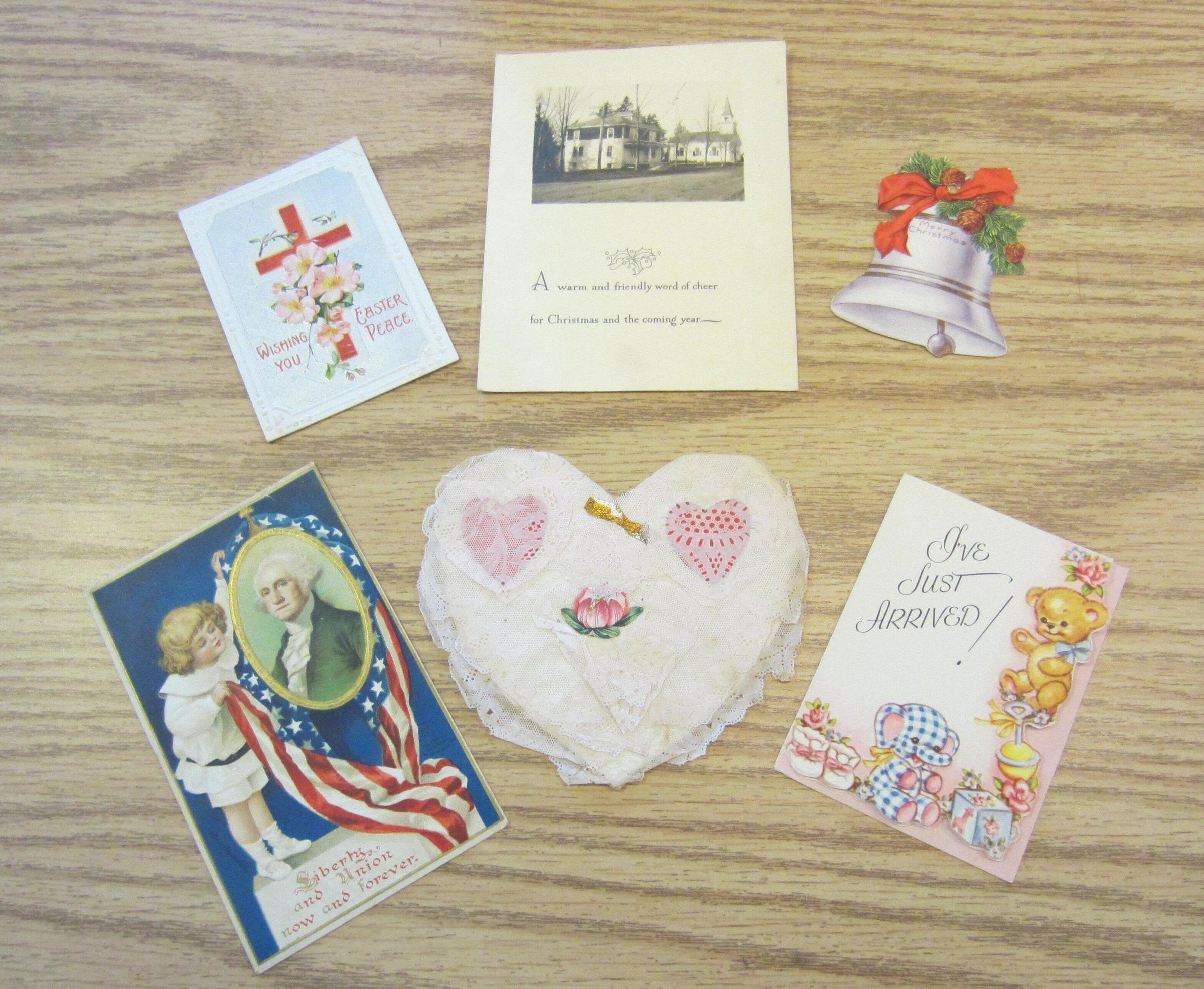 Greeting cards and birth announcements saved by Nora Pendleton: Valentines, Easter, sympathy, Birthday, Washington's b'day, Christmas, babies.