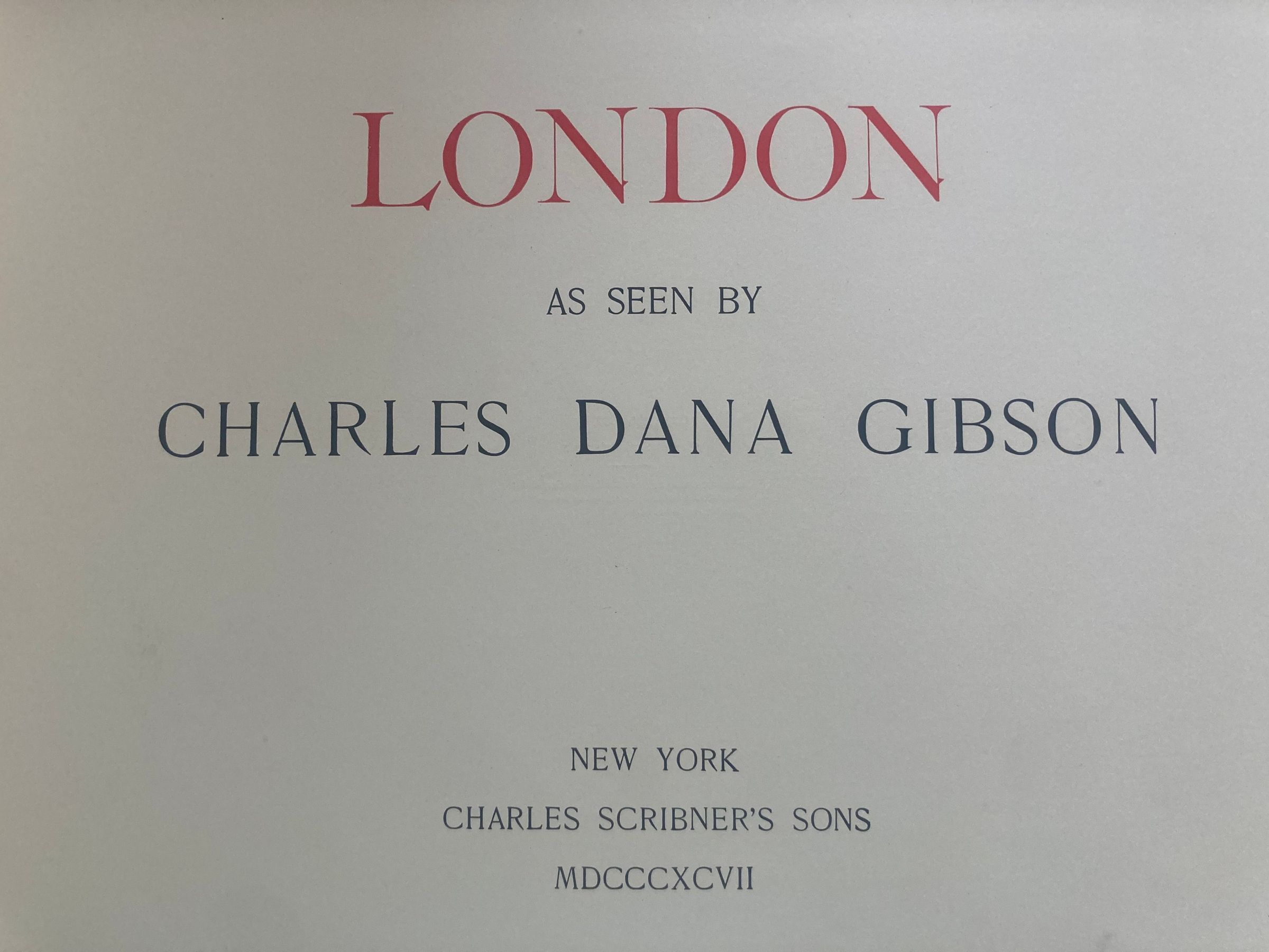 Book of drawings by Charles Dana Gibson, "London: As Seen by Charles Dana Gibson," published by Charles Scribner's Sons in 1897. Inscription on opening page reads Irina Winslow(?) de Hart, Xmas 1900, from H. V. de H."