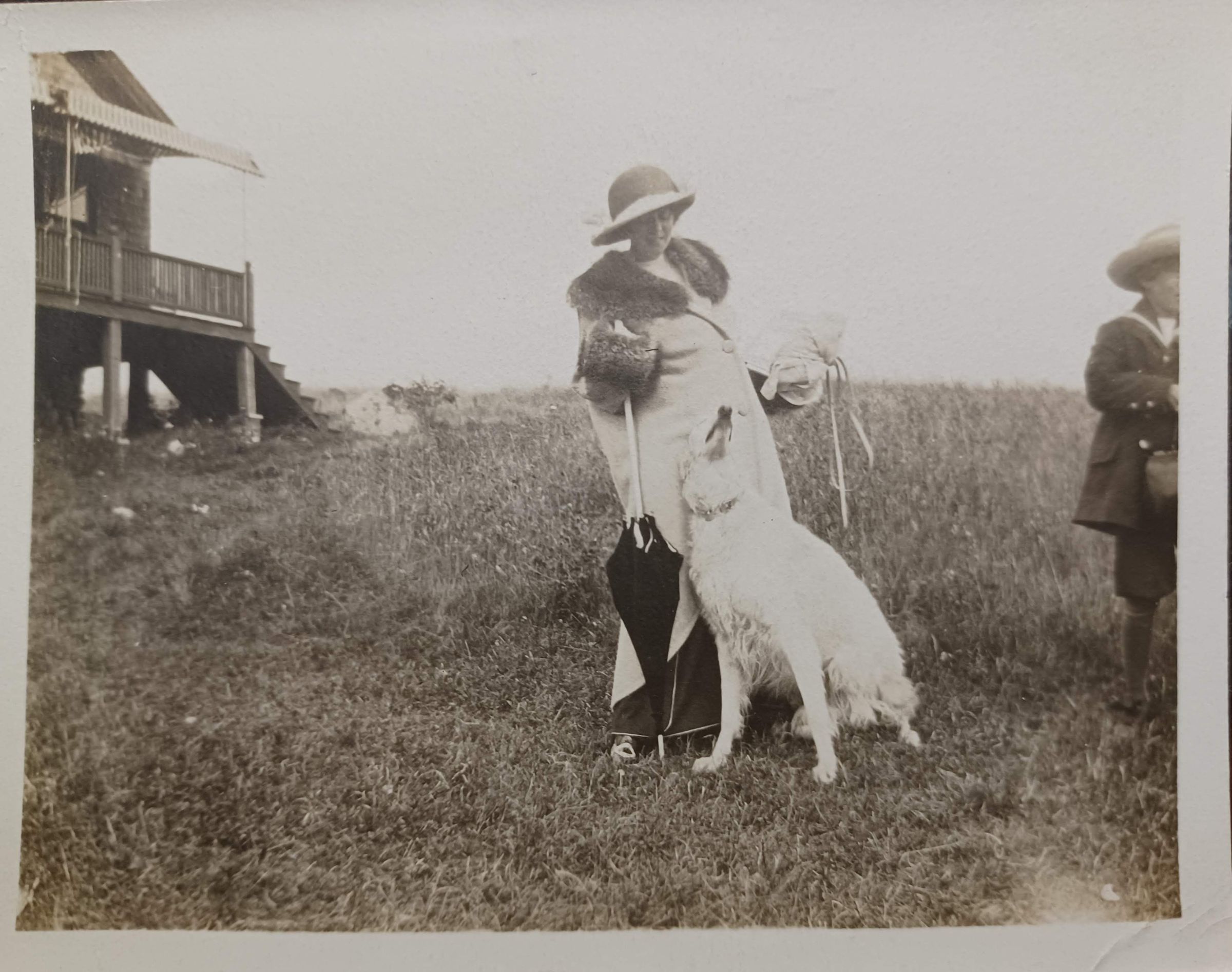 Beatrice Ashely Chanler and her dog on 700 Acre Island. Photocopy of this digital image is stored on the Archives Shelves with other items in this accession.