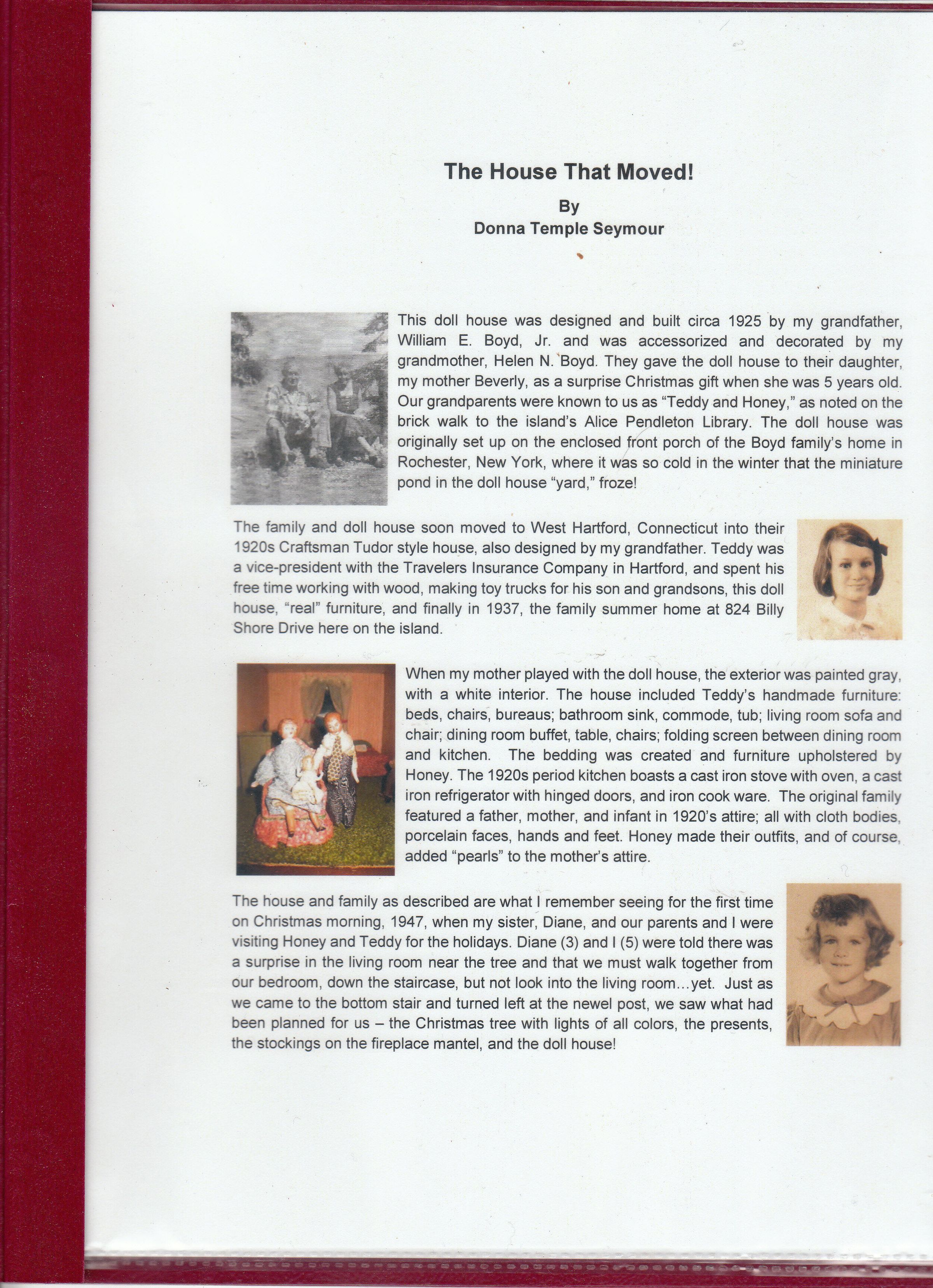 Typed story of her mother's dollhouse, with photographs, by Donna Temple Seymour. Copy 1, in plastic binding, stored with the dollhouse itself in the Museum Store.