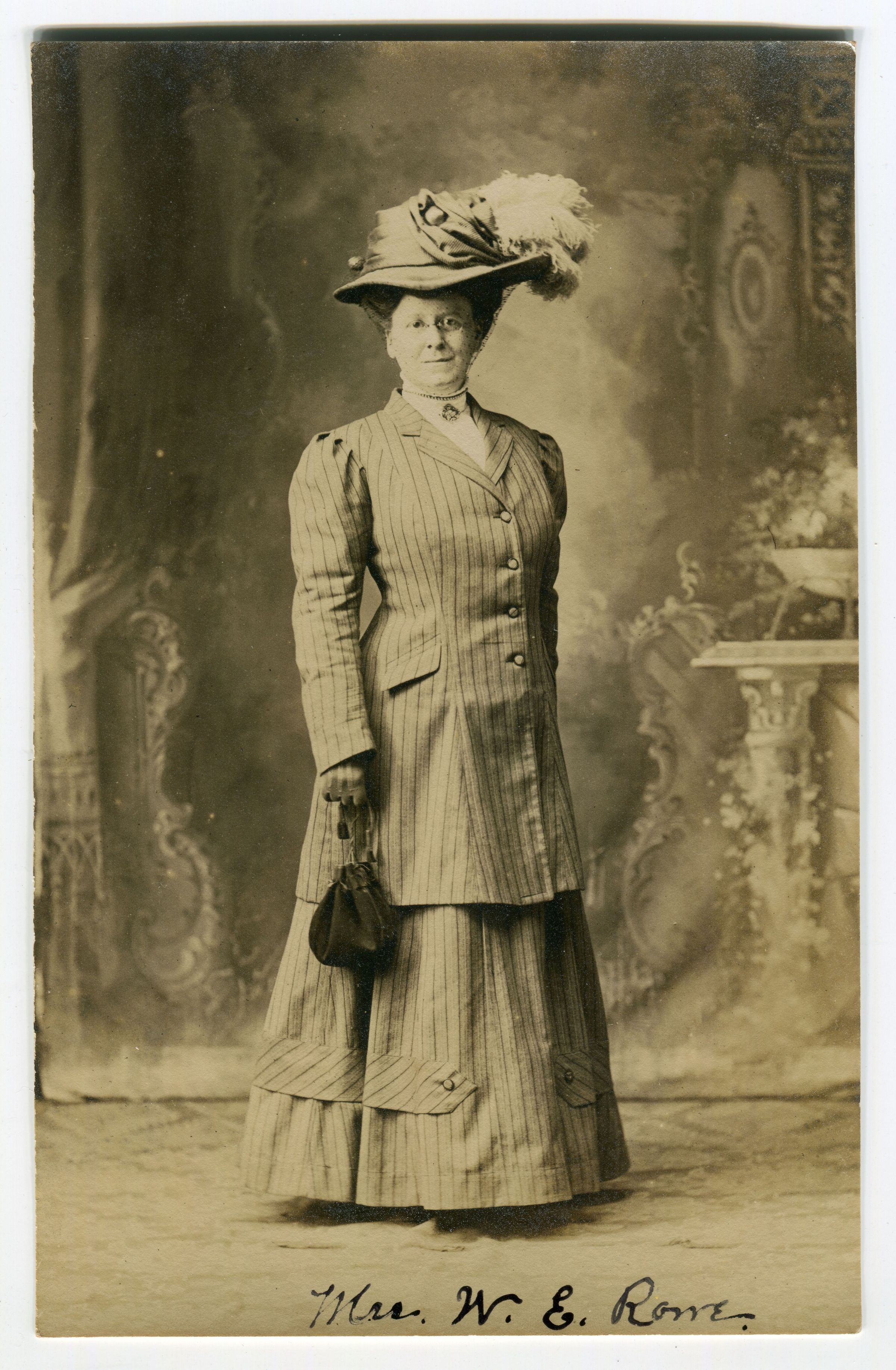 Studio portrait of Mrs. W. E. Rowe. Note on the back is dated April 13, 1911, from Pejepscot. Addressed to Mrs. Duncan. It begins thus: