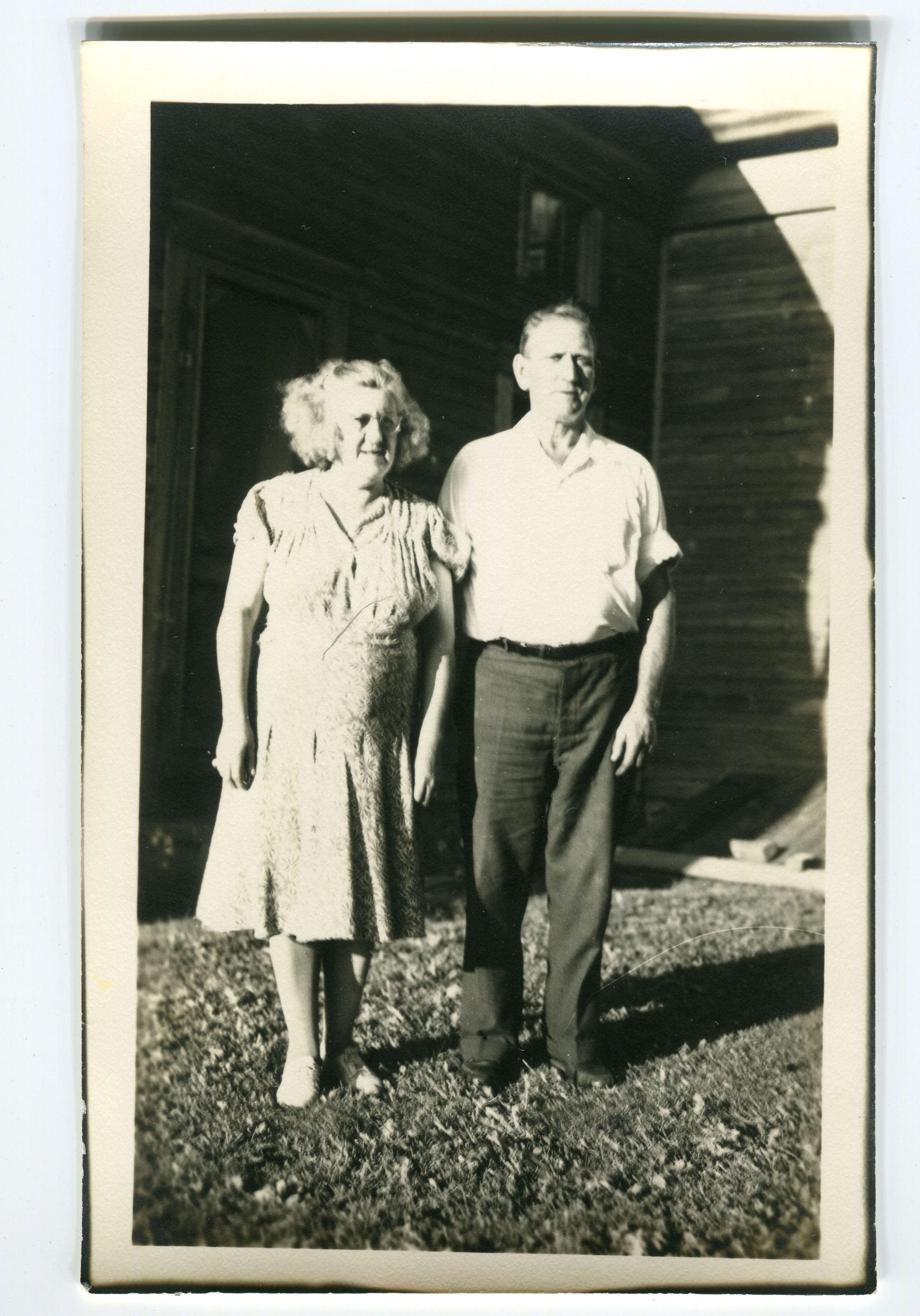 Photo of a couple in late middle age, standing in strong light outside of a clapboard house. She wears a summer dress, calf-length; he is in shirt sleeeves and dark slacks. Indentified on the back: