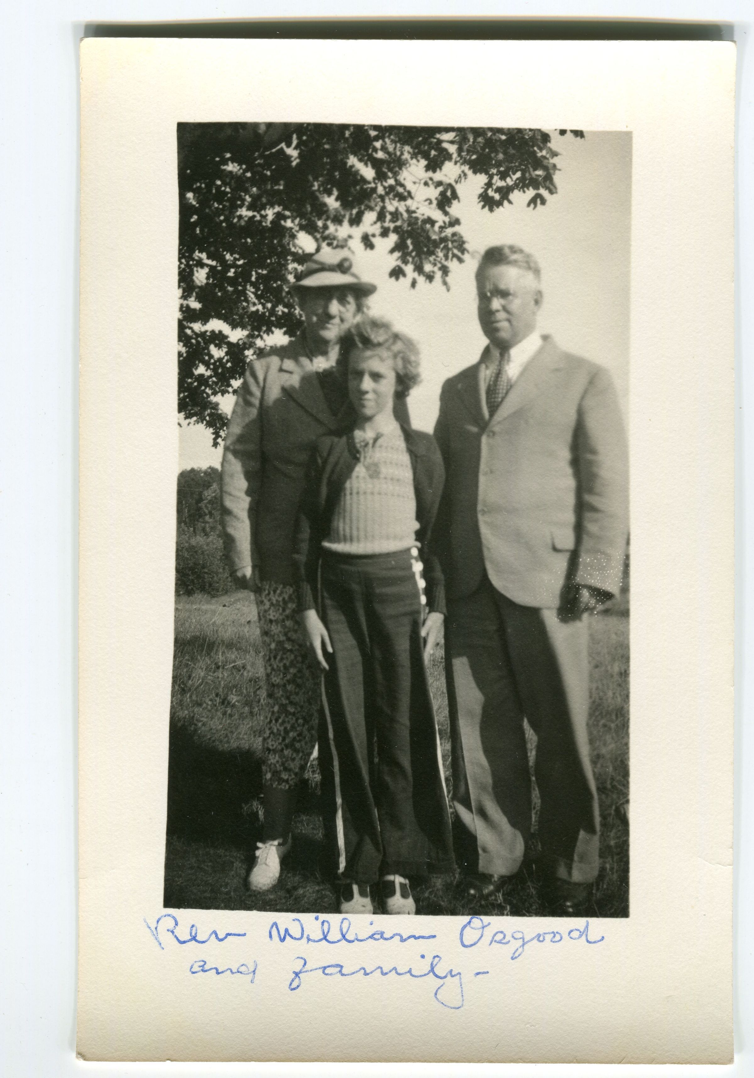 Outdoor photo of middle-aged couple and a young girl. Identified on the front: "Rev. William Osgood and family." Identified on the back: "Mr and Mrs Osgood and Kather[i]ne."