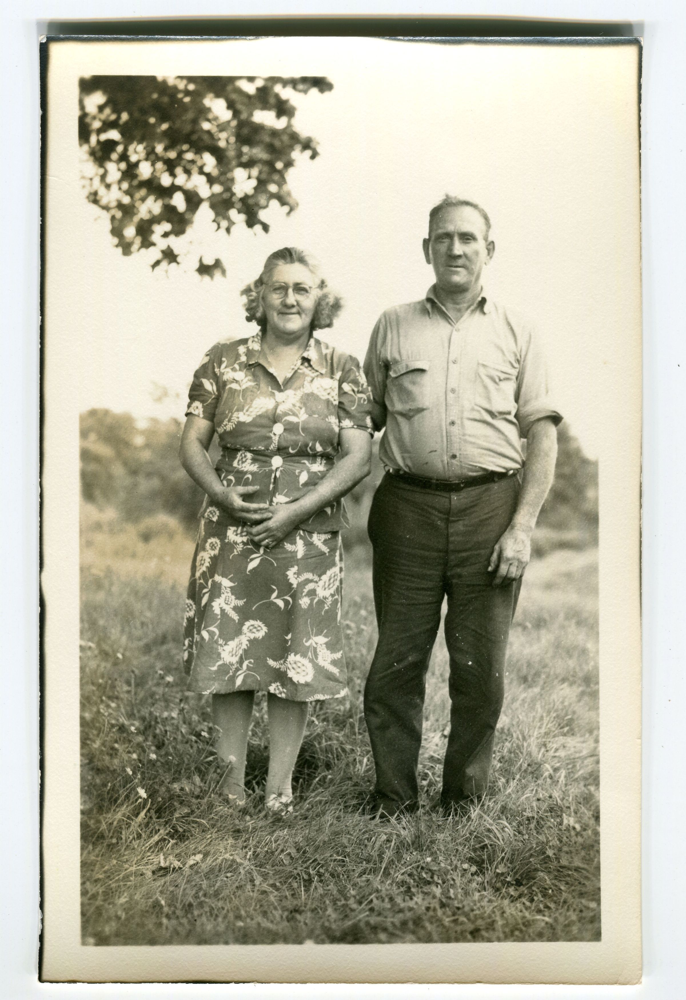 Photo of a couple in late middle age standing in a field. She wears a summer dress, calf-length; he is in shirt sleeeves and dark slacks. Indentified on the back: