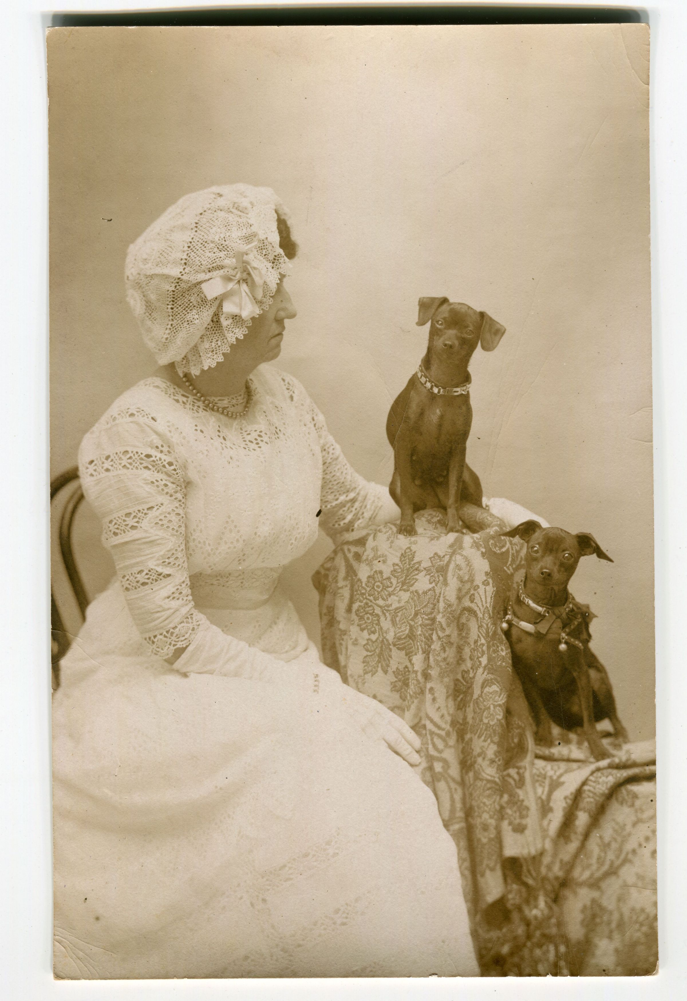 Studio portrait of Mrs. Georgia Allen and her dogs. She is dressed in white lace, with a string of pearls, a white lace mob cap, and elbow-length gloves. Her two very small dogs wear decorative collars, one more a harness with bells.