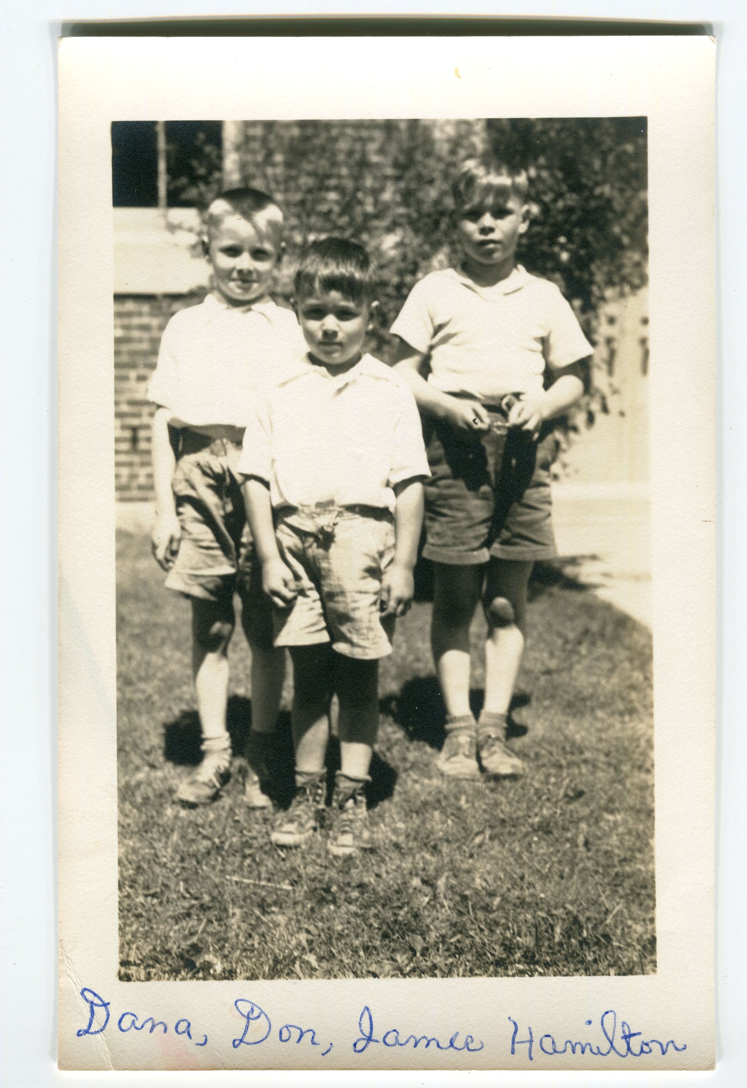 Photo of three little boys in shorts. Identified on the front as Dana, Don, and James Hamilton; on the back as sons of Mr. and Mrs. Clarence Hamilton.