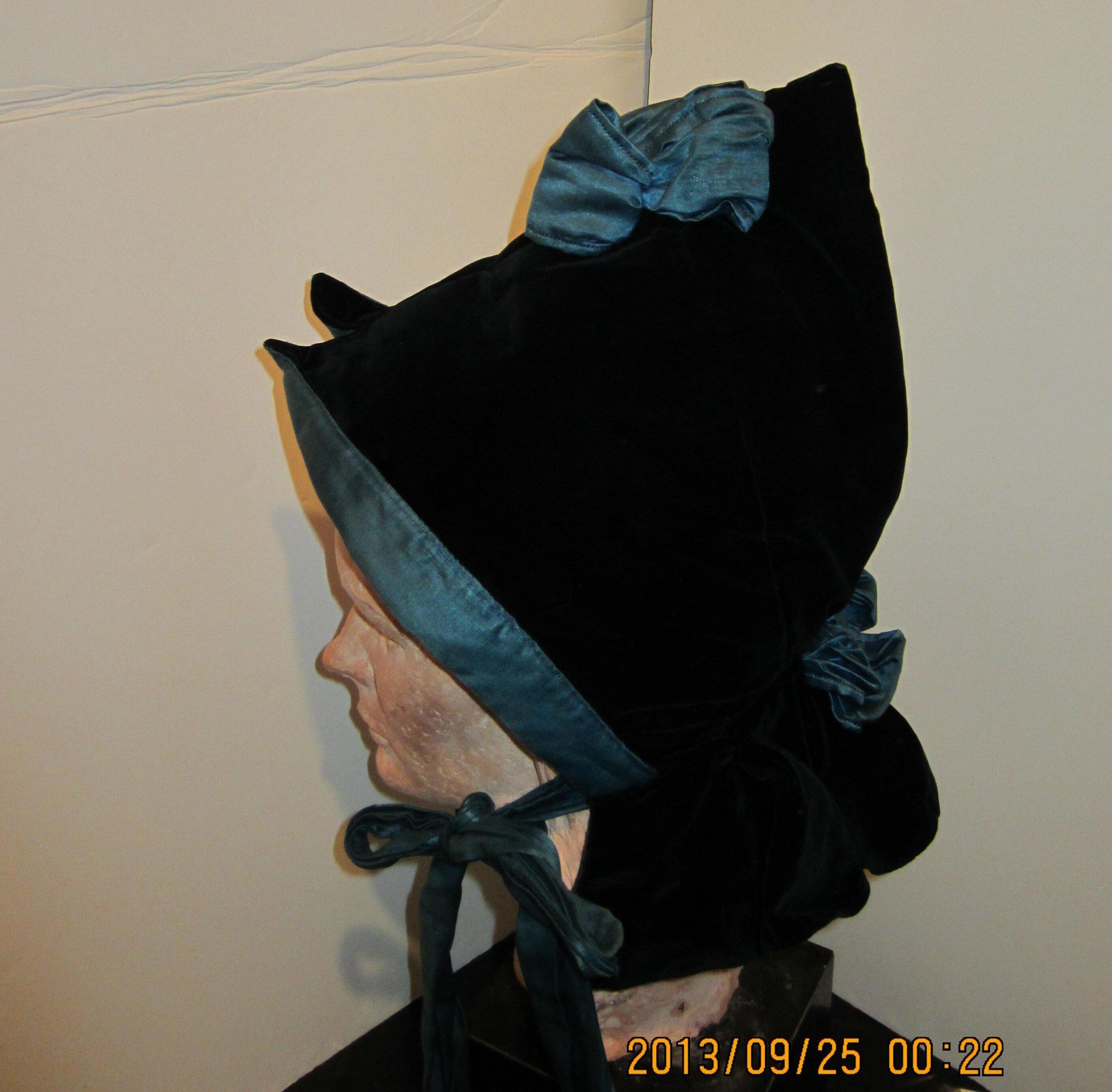 A black velvet bonnet accentuated with blue satin. The trim on the inside and the bottom ruffle are lined in blue satin, as well as, there being two blue satin bows on the top of the head and on the back of neck and the ties. The inside is lined in a woven white wool.