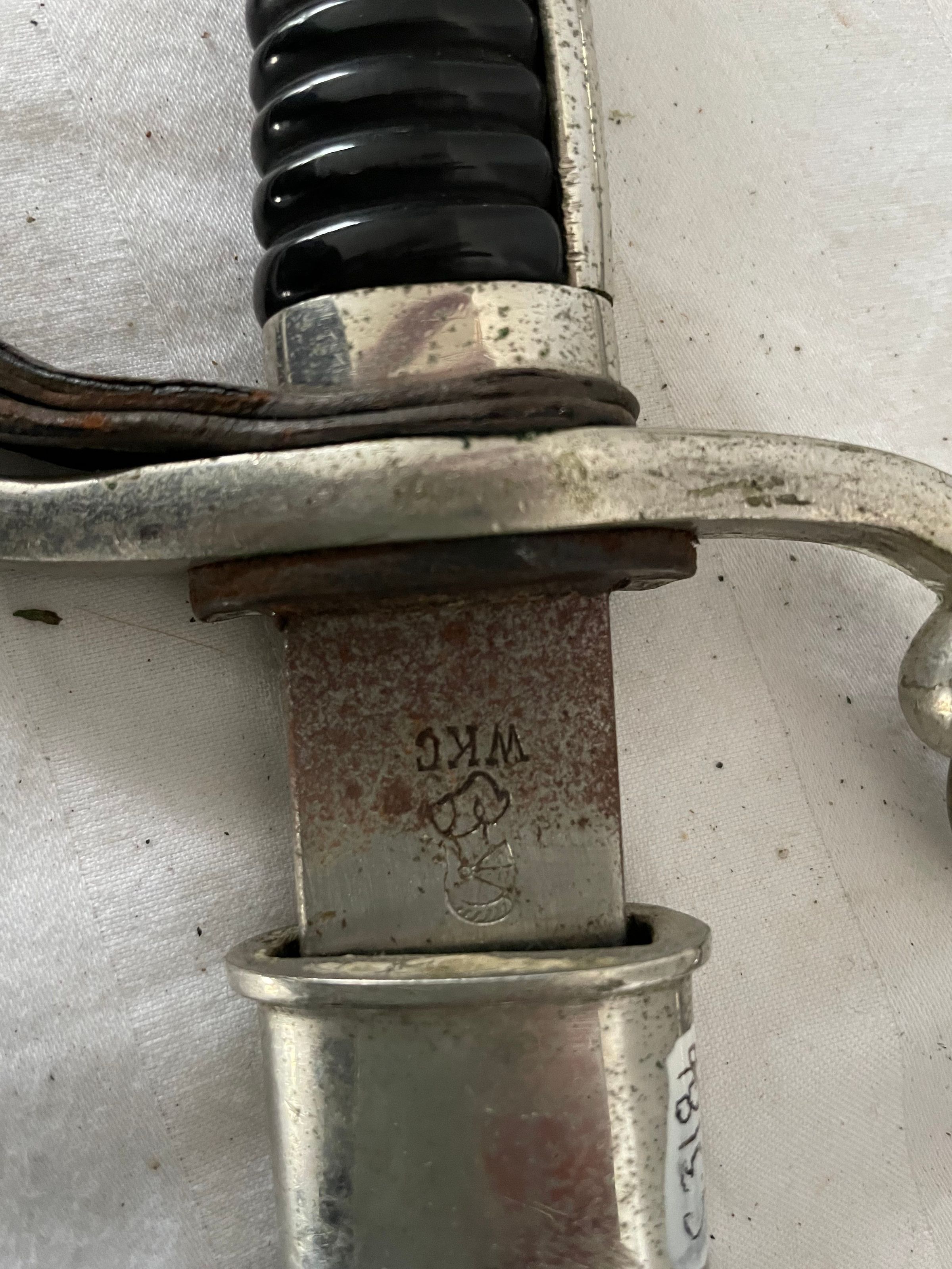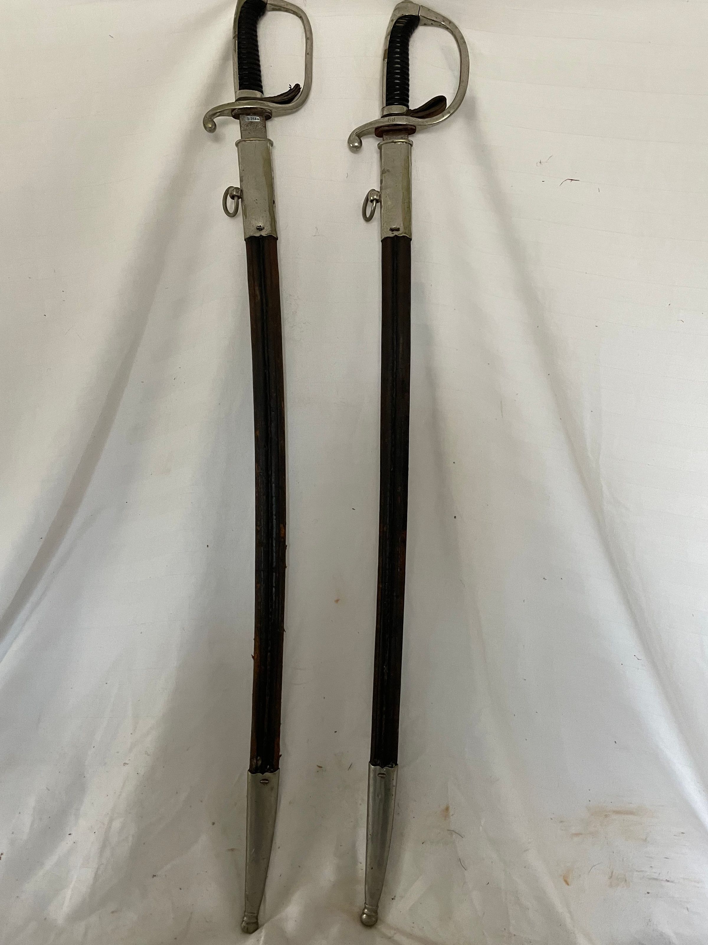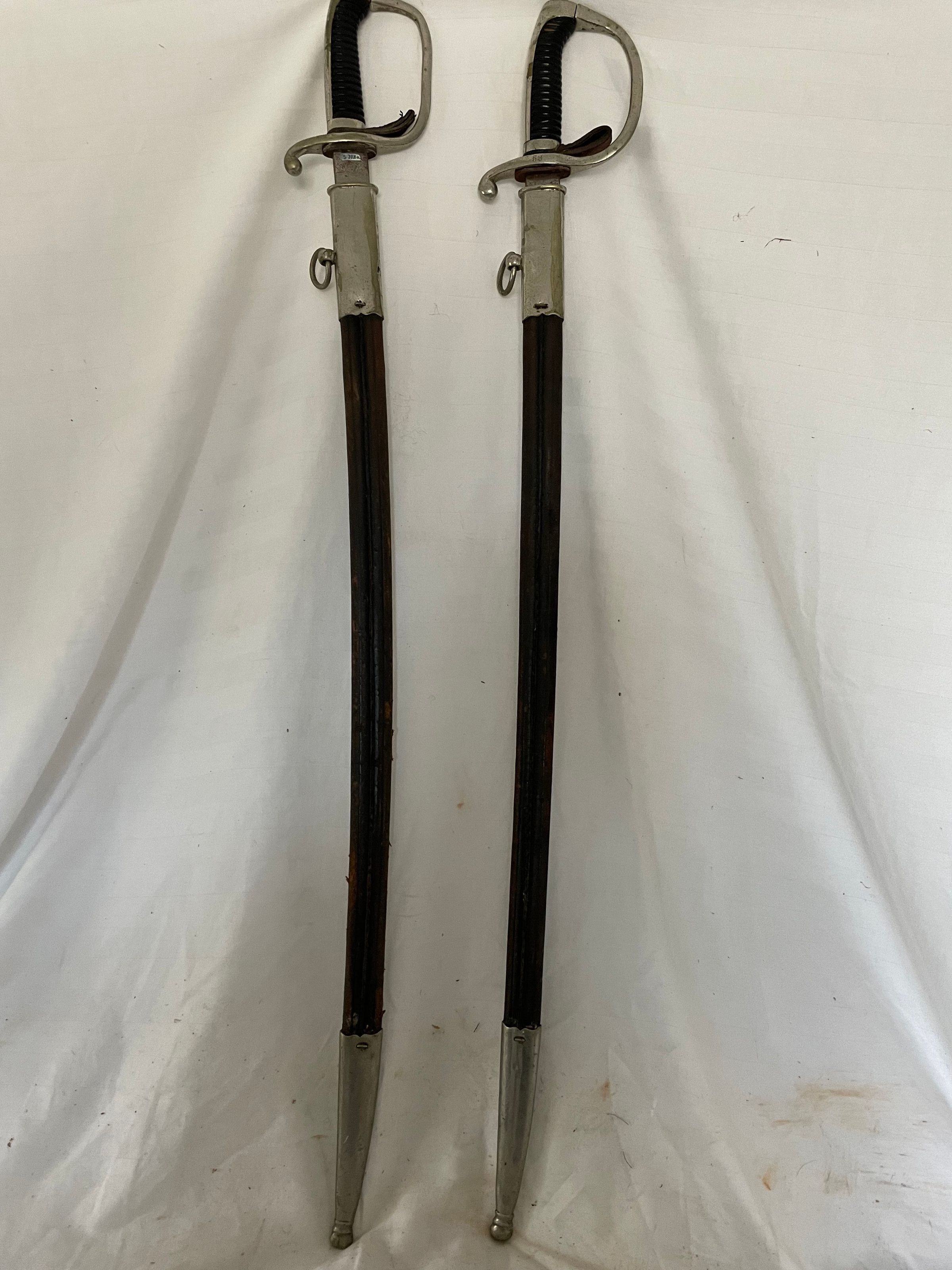 Two sword with silver and leather scabbard, they appear to be identical with different marking etched in. they read WKC on the blade. One is numbered 58.