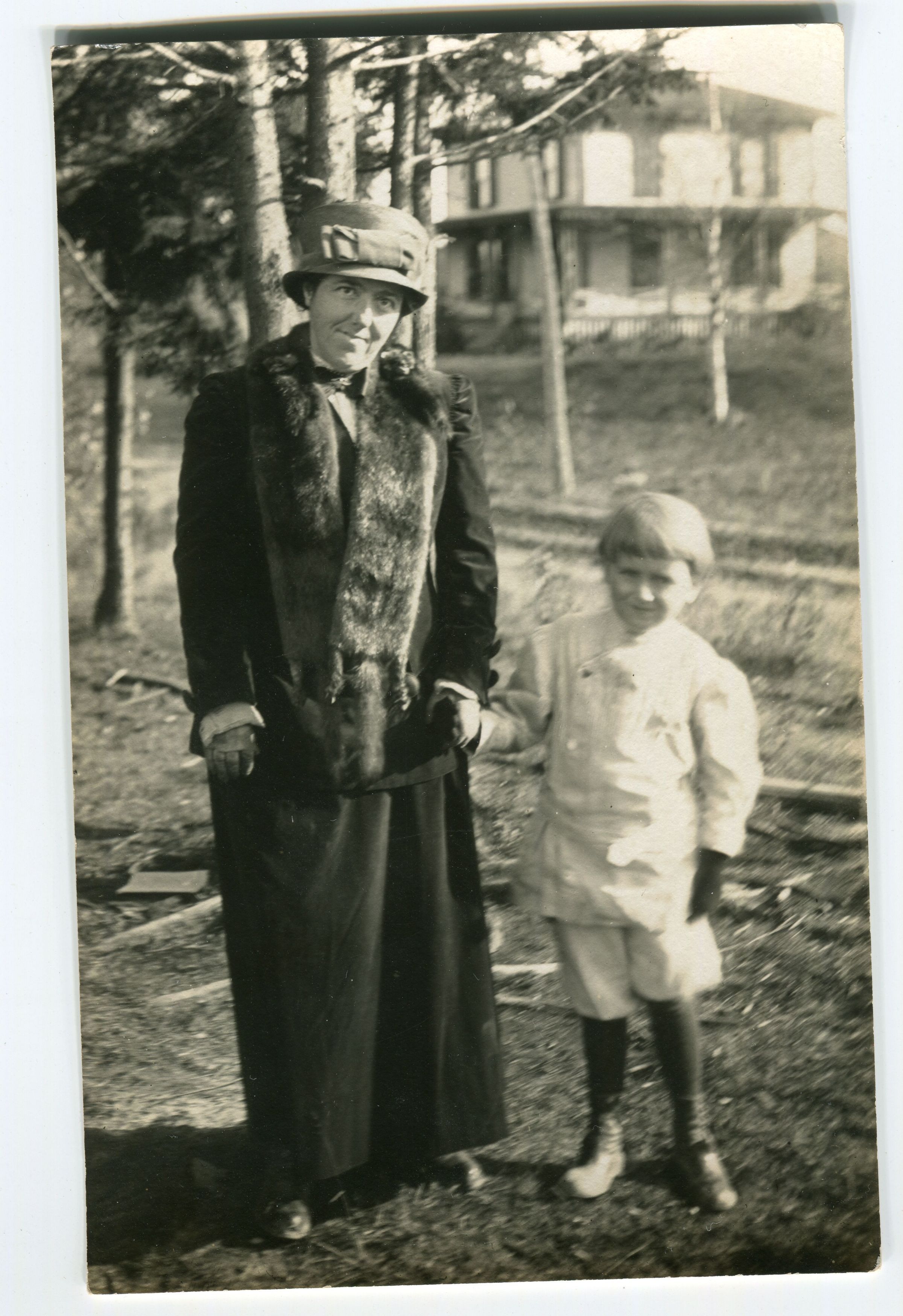 Photo of woman in long dark coat, fur wrap, and dressy hat with boy from 2015.026.074. Identified on the back: 'Miss Grace Pendleton and nephew."