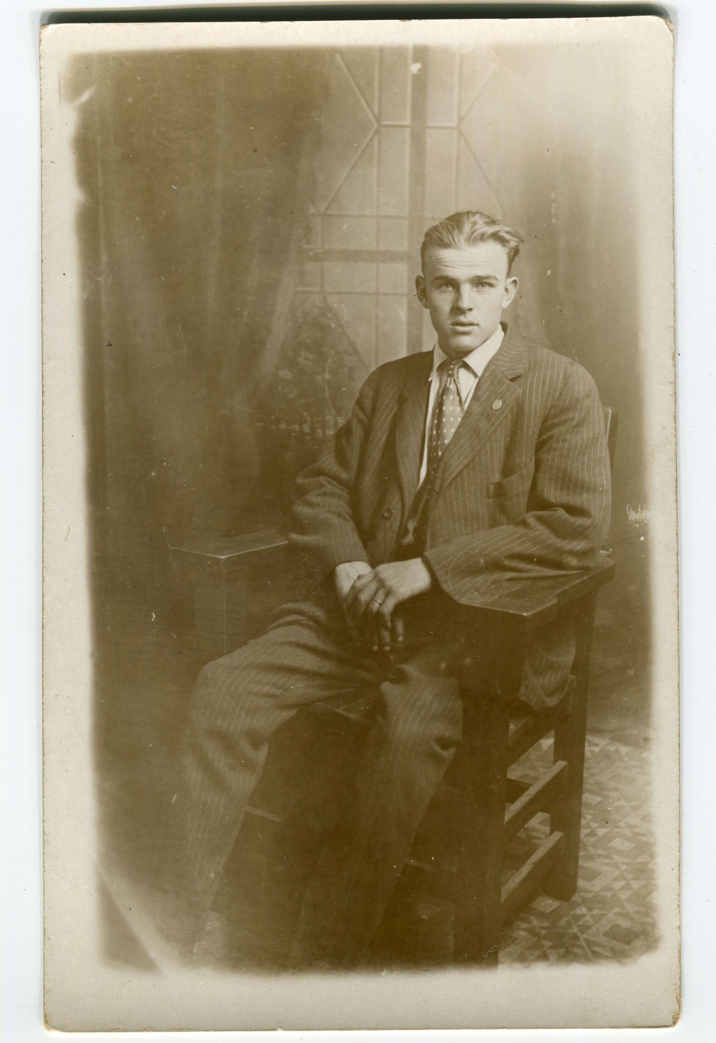 Duplicate studio portraits of same young man in 2015.026.076. He is seated in this pose. His hair is combed back, he wears a pinstriped suit and a polkadot tie, a wedding ring is visible on his left hand and an emblematic pin in his left lapel.