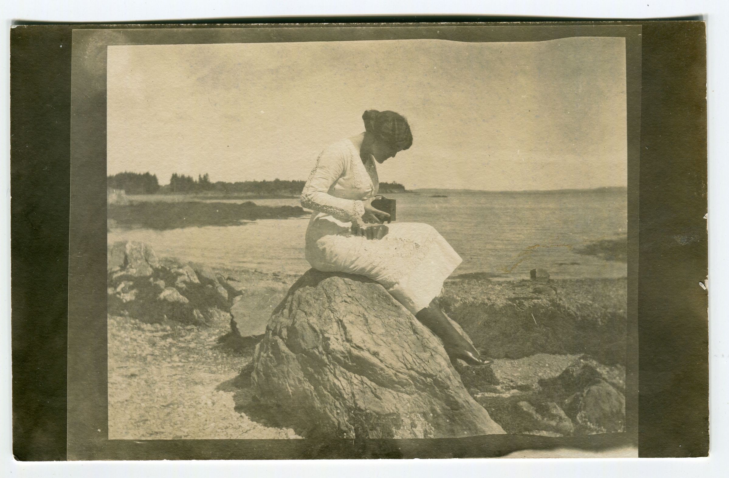 Outdoor portrait of young woman on the shore. She wears a white dress, dark stockings and shoes, and is seated on a rock holding a small box camera. Identified on the back as Desdemona P. Flick. Pose and attire are identical to 2015.026.078.