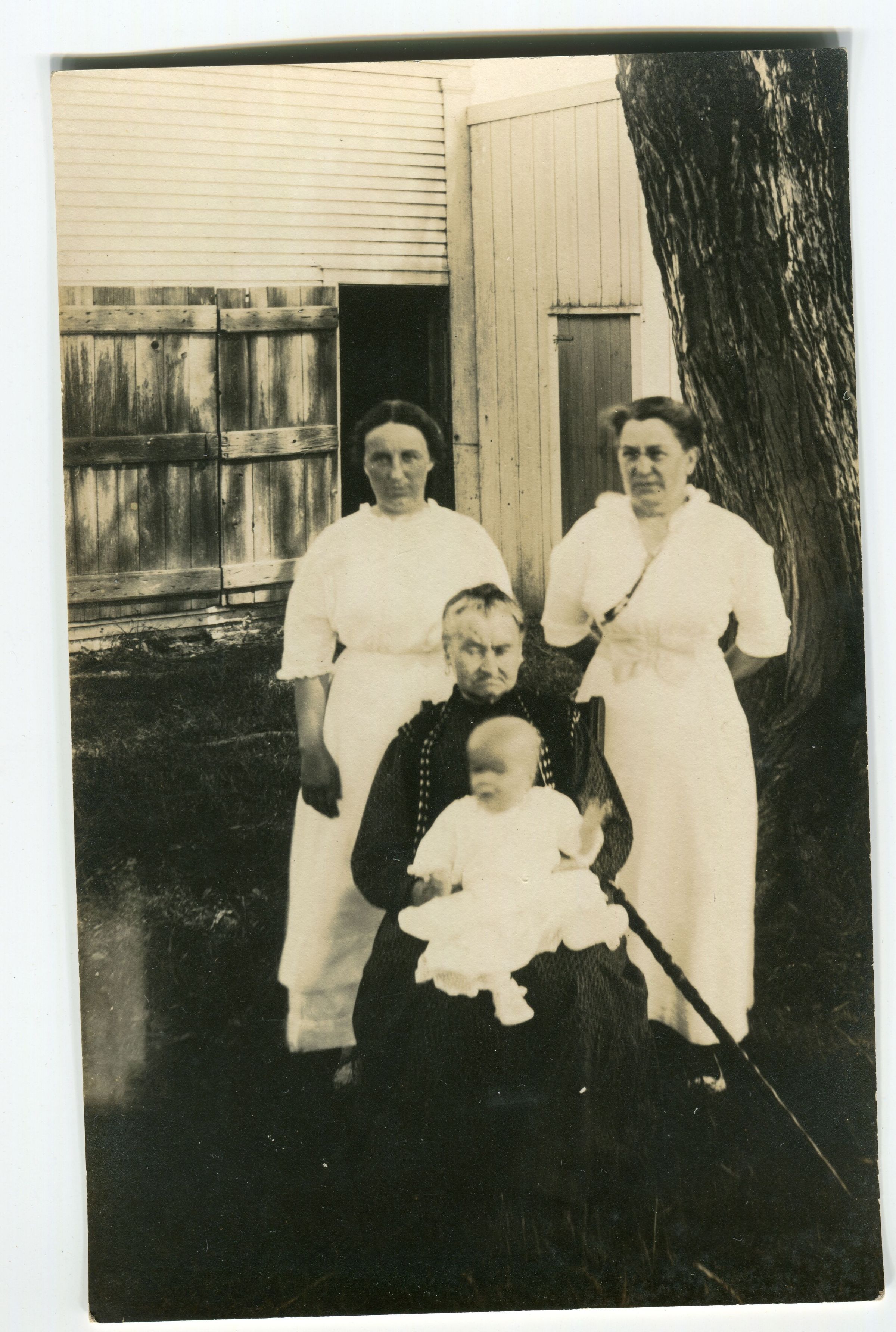 Photo of three women and a baby. The two younger women, dressed in white, stand behind an older woman in a dark dress and cap, a bald infant in white on her lap. Identified thus on the back: