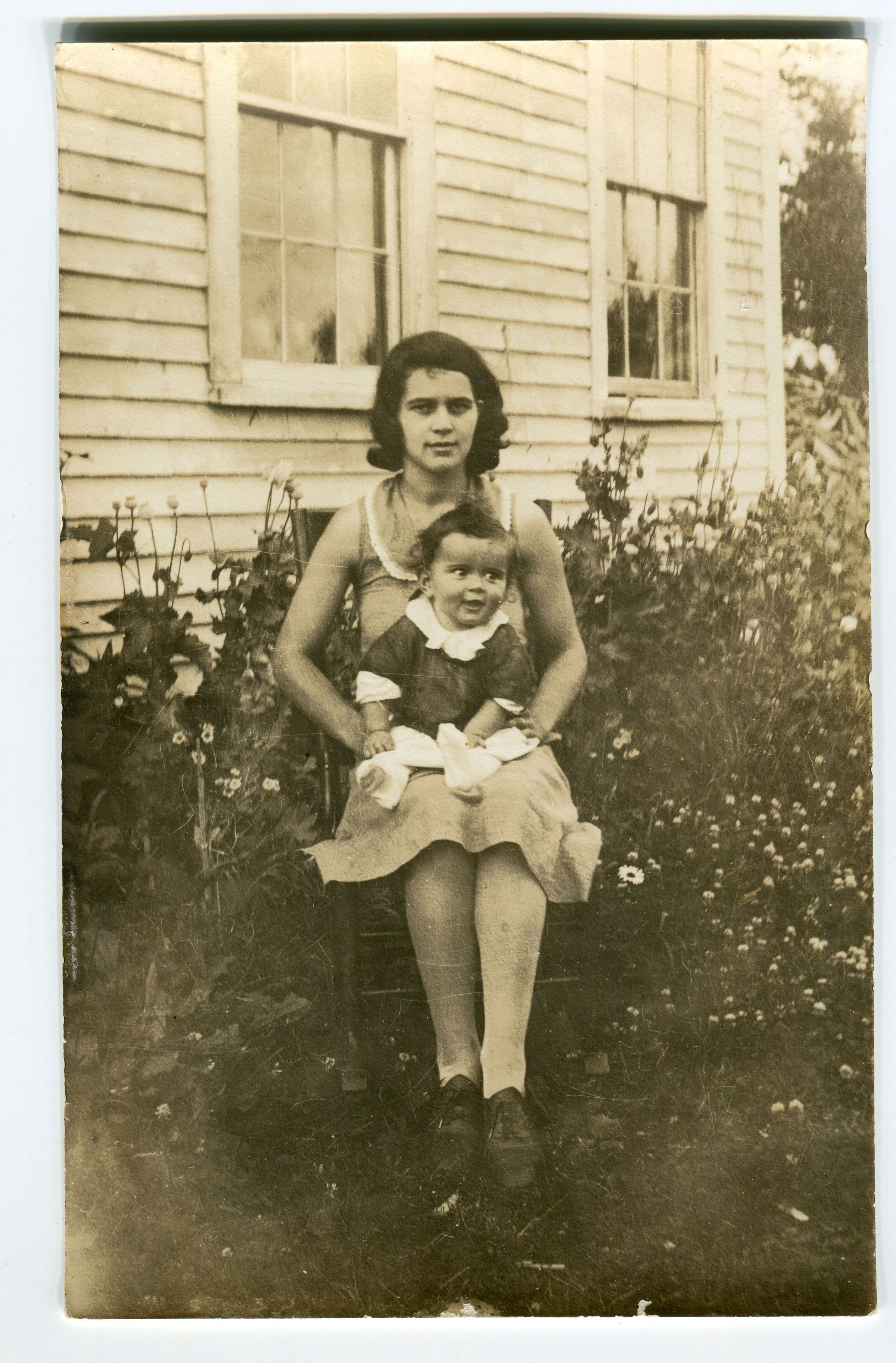 Dark-haired young woman sitting outside a clapboard house with a bright-eyed baby on her lap. 1940s attire? Identified on the back: "Percy Clements daughter"