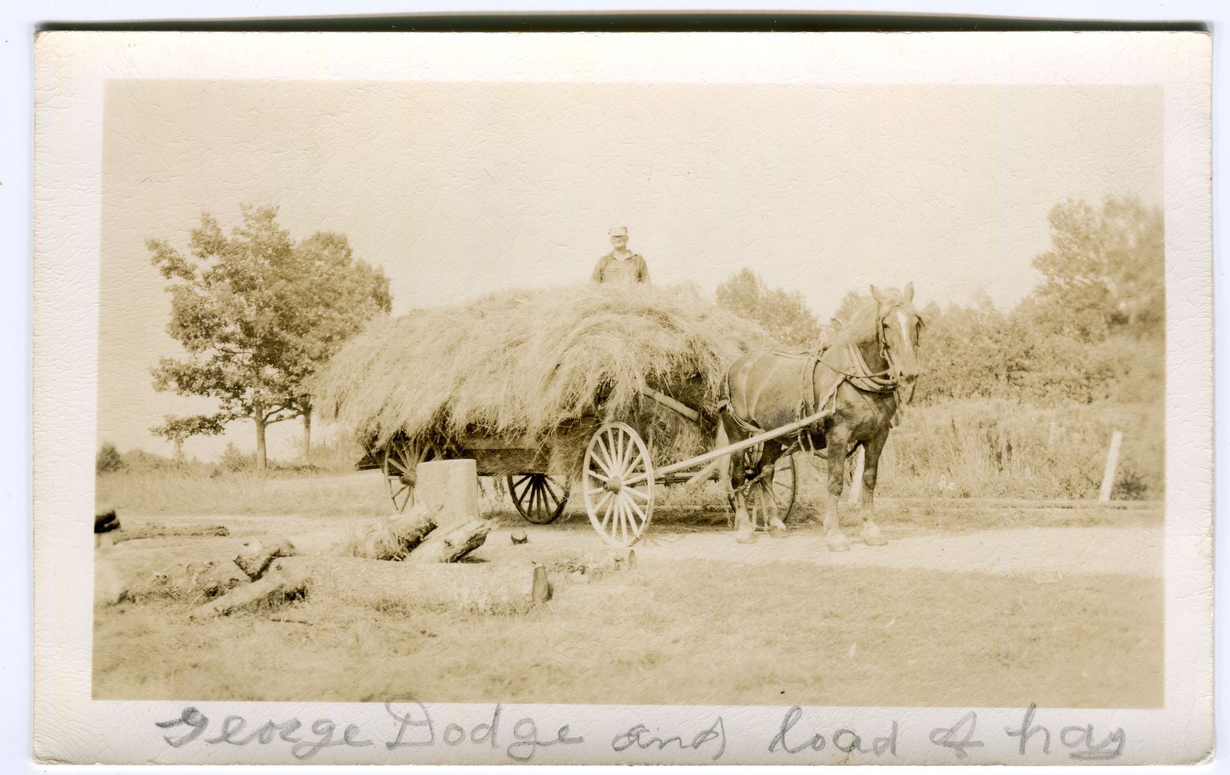 George Dodge on top of a load of hay in a horse-drawn wagon.
