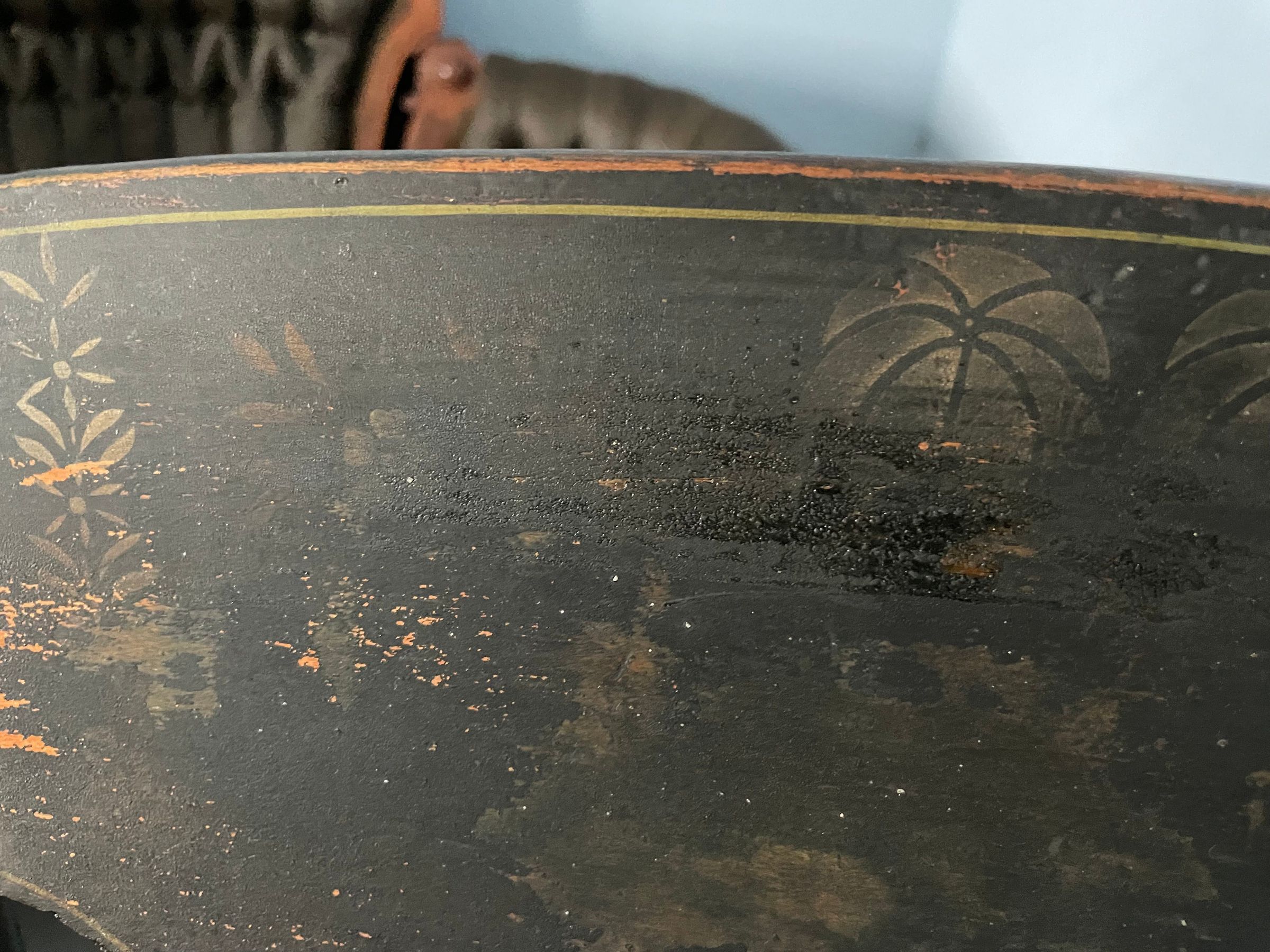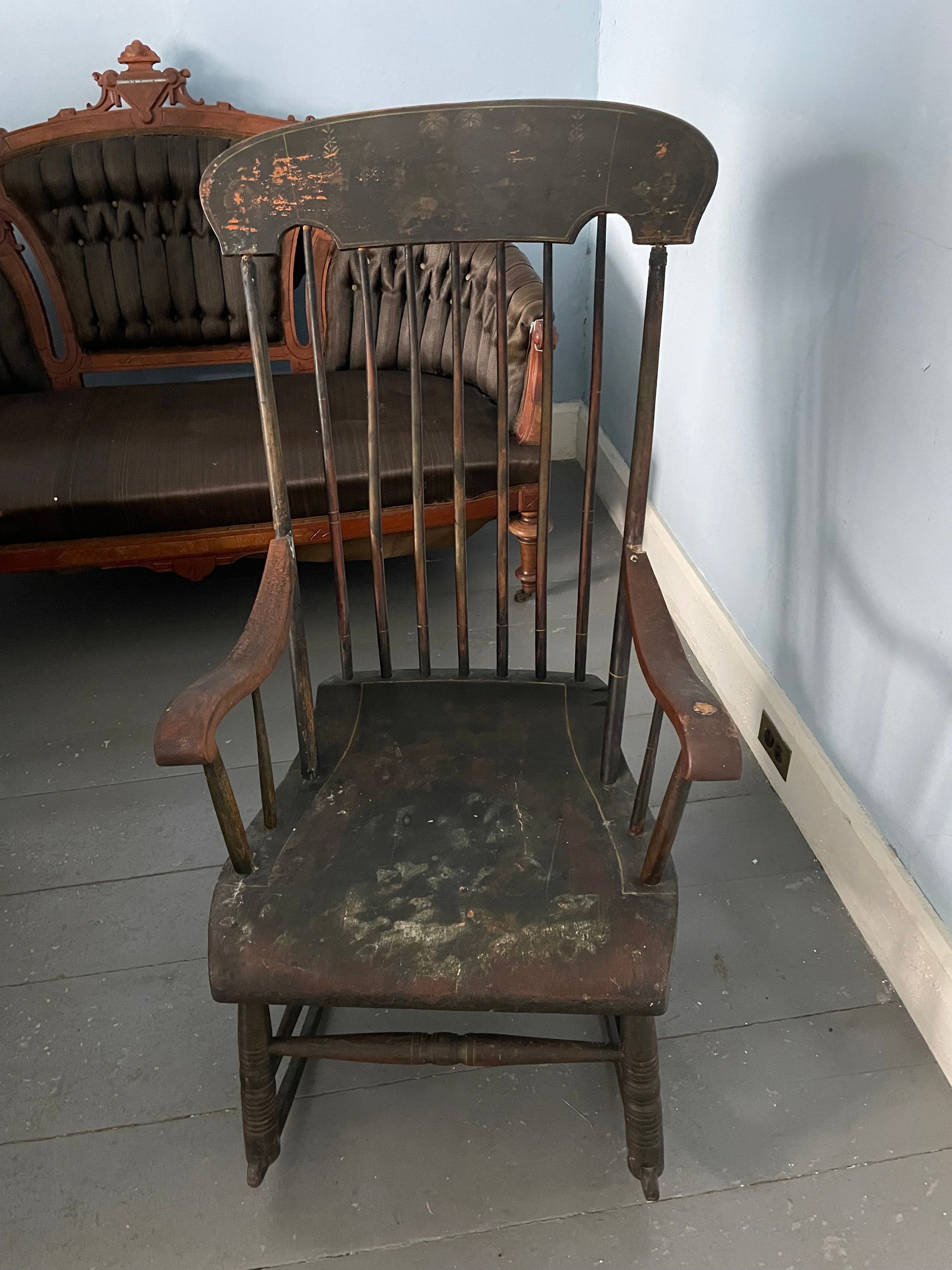Boston rocker with fading stenciled designs. Made of wood. High back.