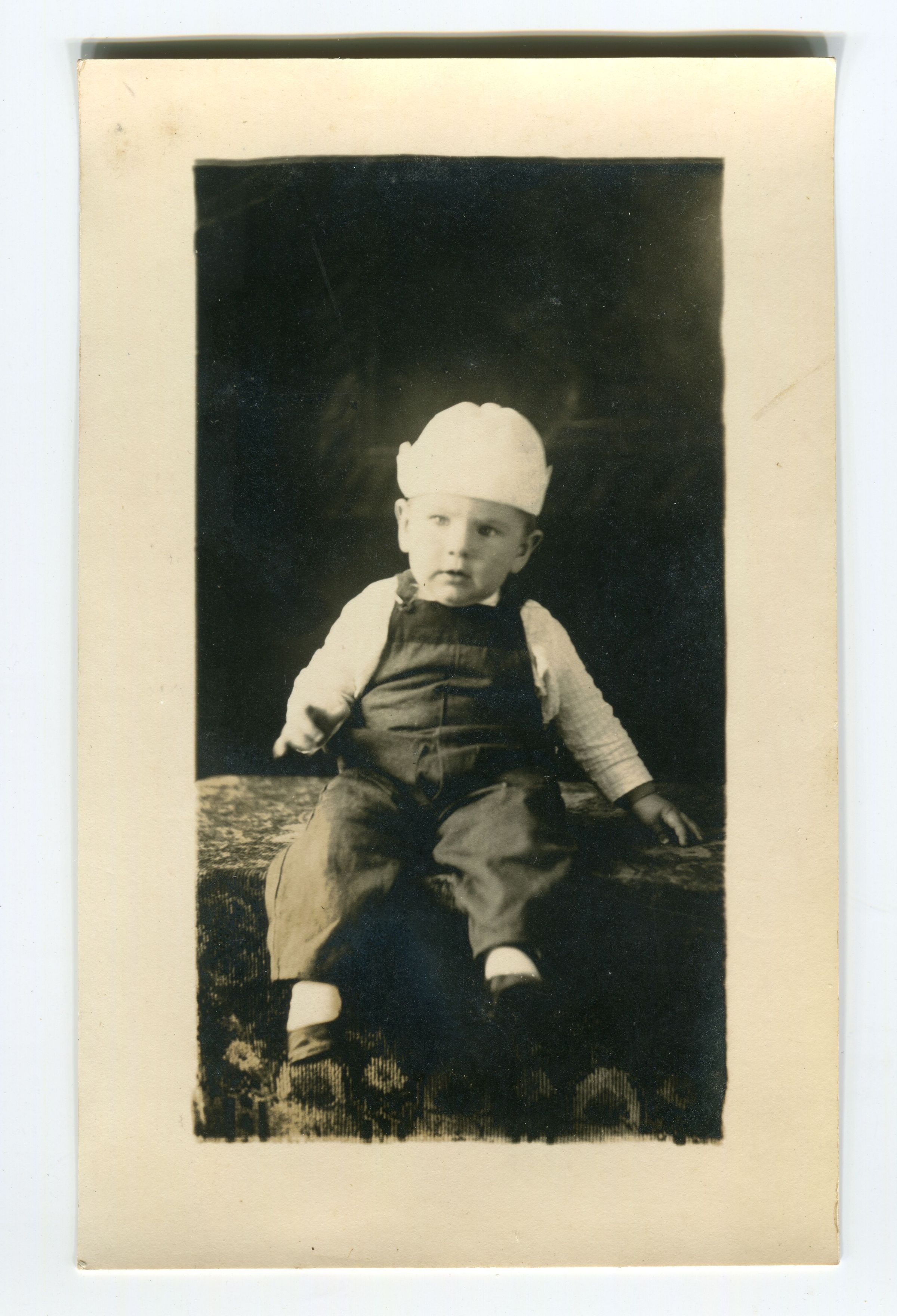 Studio portrait of toddler in dark overalls and a white cap. Identified on the back: "Donald Scott Stelle [Steele?] age 11 months"
