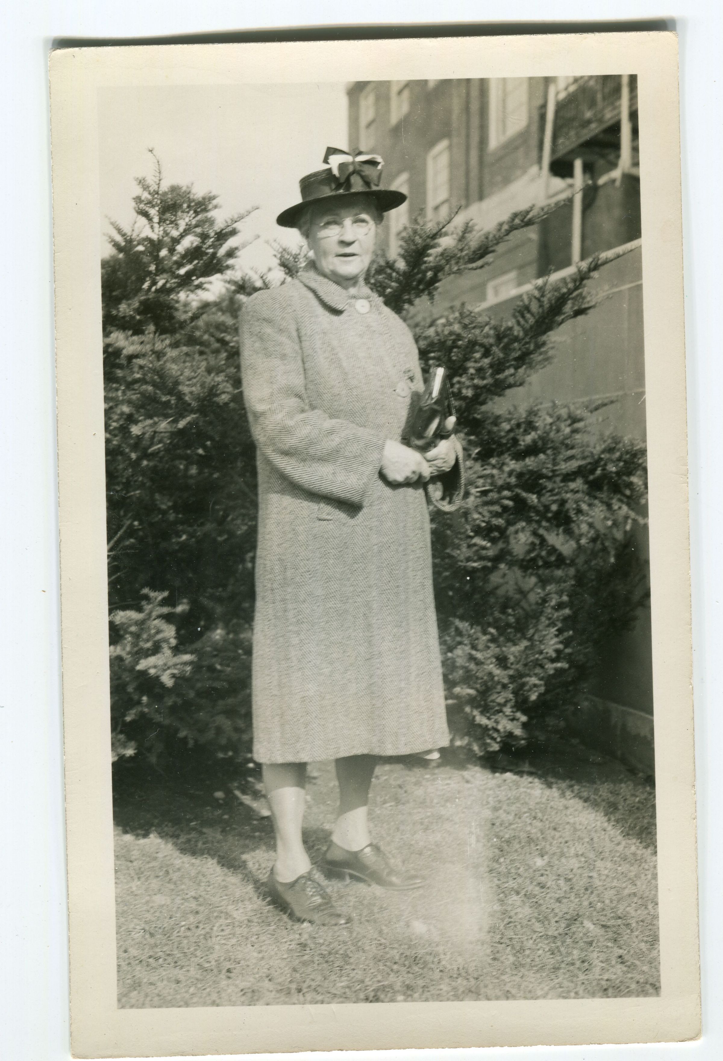 Lura Duncan in a tweed coat and dark hat. Photographed off island, as she is standing outside a large brick building.