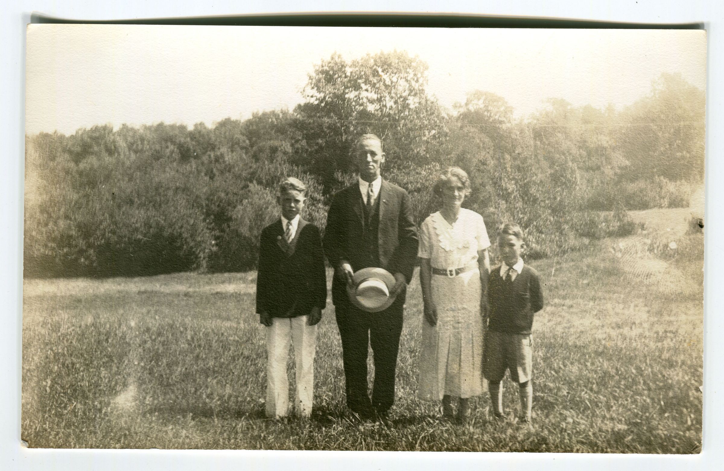 Warrin [Warren] Babbidge, his wife, and their two boys posed for a family portrait outside. All very smartly dressed: older boy in white trousers, blazer, and tie; Mr. Babbidge in dark suit with straw hat; Mrs. Babbidge in a white shirtwaist dress; younger boy in shorts, knee socks, sweater, and tie.