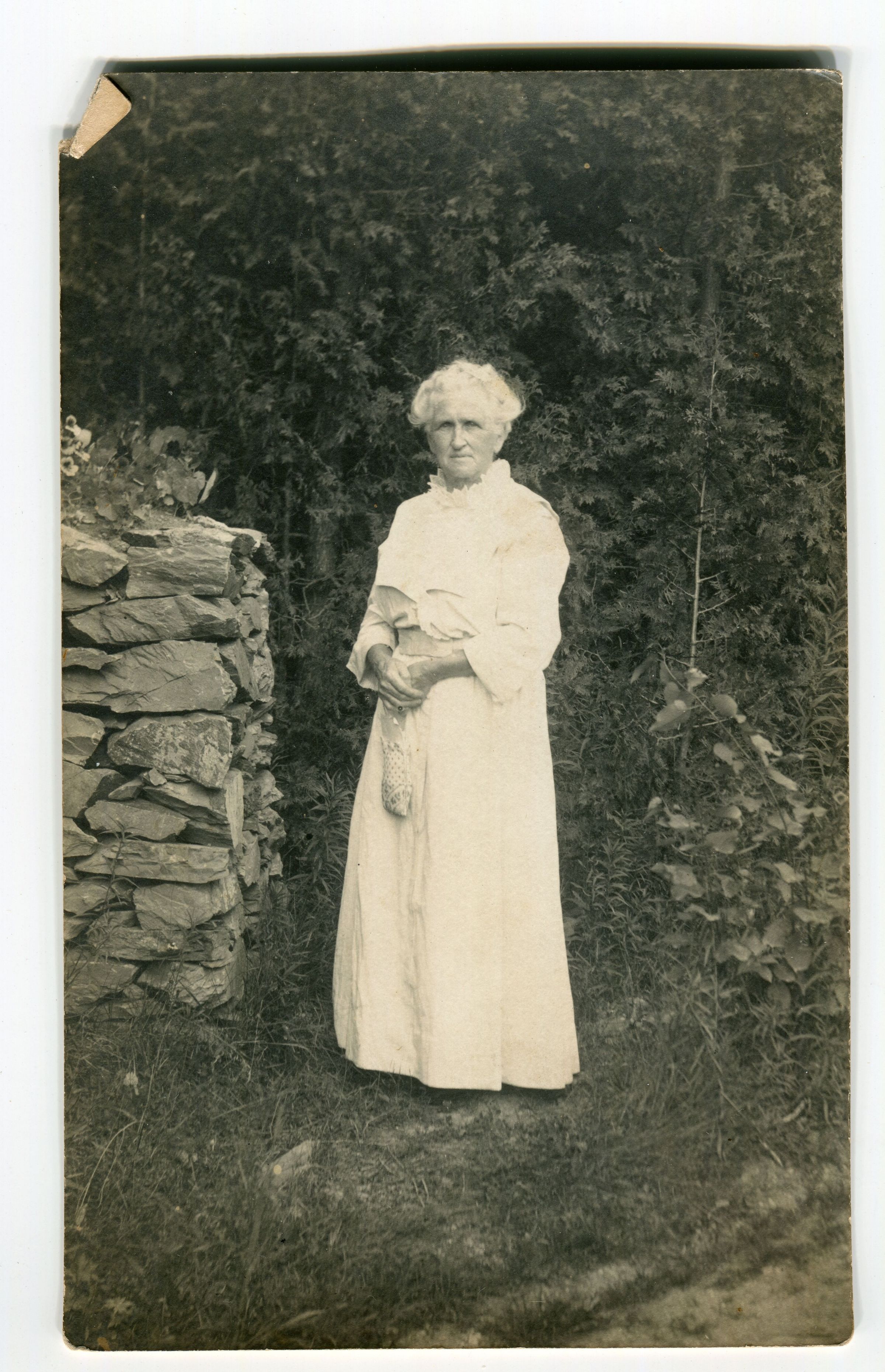 Outdoor portrait of a white-haired woman in a white dress. She stands formally next to a stone wall, her hands folded over a small purse.