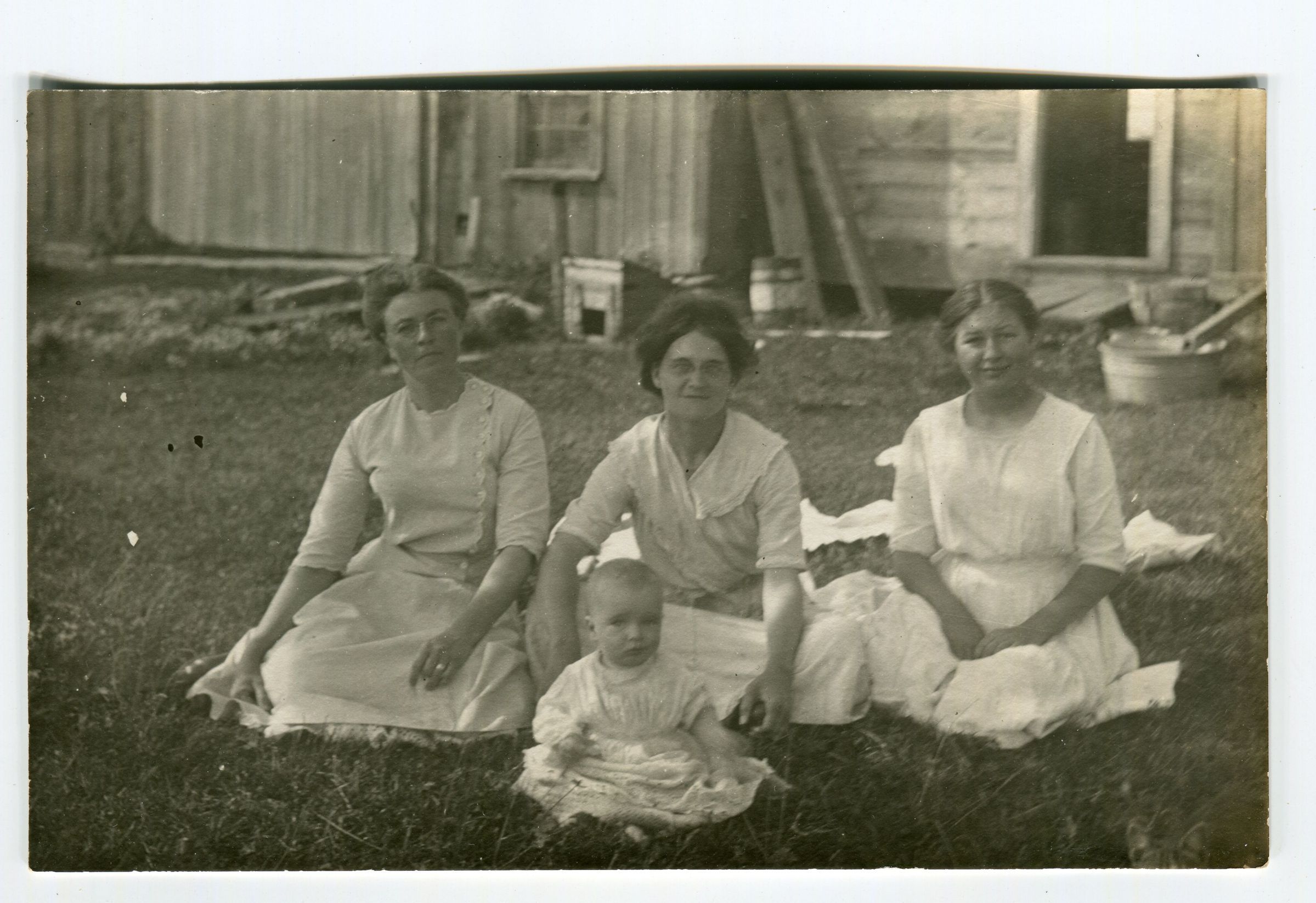 Three women in white dresses and a baby in a white gown--all sitting on the lawn next to a clapboard house