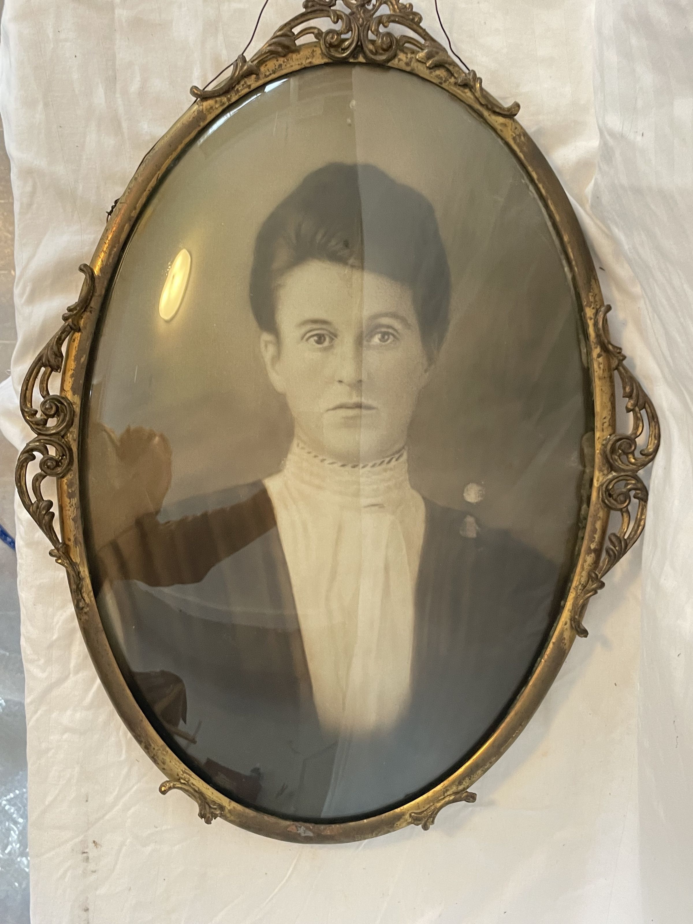 A oval framed portrait of an unidentified woman, potentially "Celia" but it is unconfirmed and there is no family known.