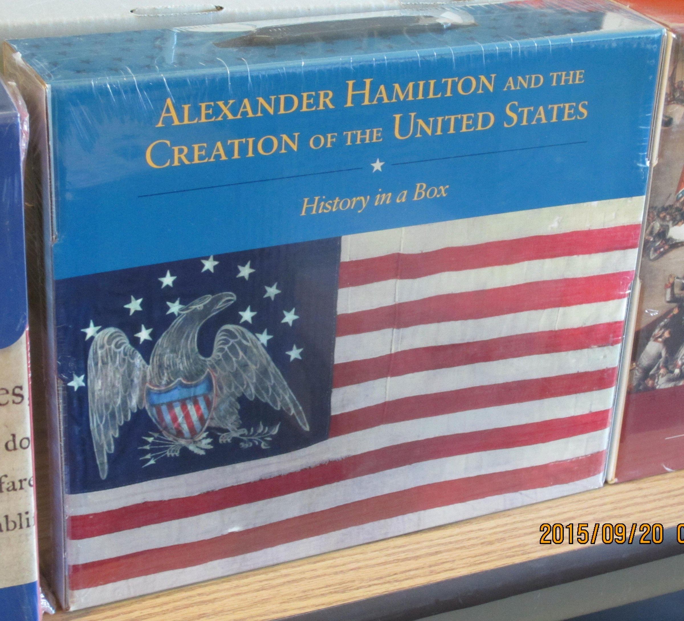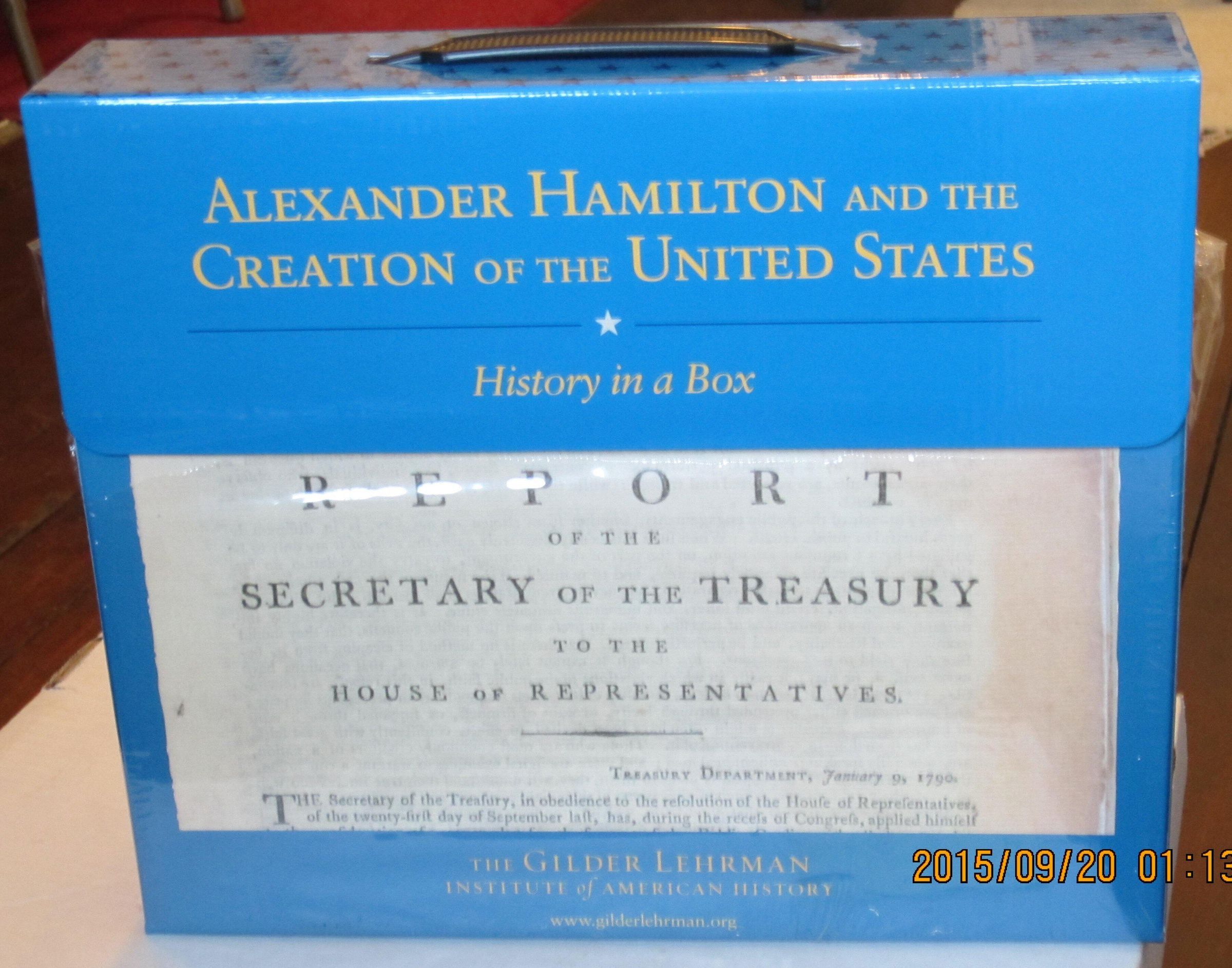 ALEXANDER HAMILTON AND THE CREATION OF THE UNITED STATES. Collection of multimedia materials in a "History in a Box" including: 240-pp paperback biography of Alexander Hamilton, "The Man Who Made Modern America"; DVD of 6 lectures plus a video of the NY Historical Society exhibition on Hamilton; DVD of a play "Alexander Hamilton in Worlds Unknown"; booklet of 35 pp and an Educator's Guide, with CD ROM of both, on Hamilton; Discussion questions on Washington, Burr, Federalist Papers, NY African Free School No. 2, Money in the Founding Era; Timeline poster on Hamilton and world events of his era; 11" x 17" portraits of Hamilton and Jefferson; 22" x 17" posters of Surrender at Yorktown, Signing of the Constitution, 1st draft of the U S Constitution, Hamilton's Directive following the federal assumption of state debts in 1791; the 56pp book "Slavery in the Founding Era."