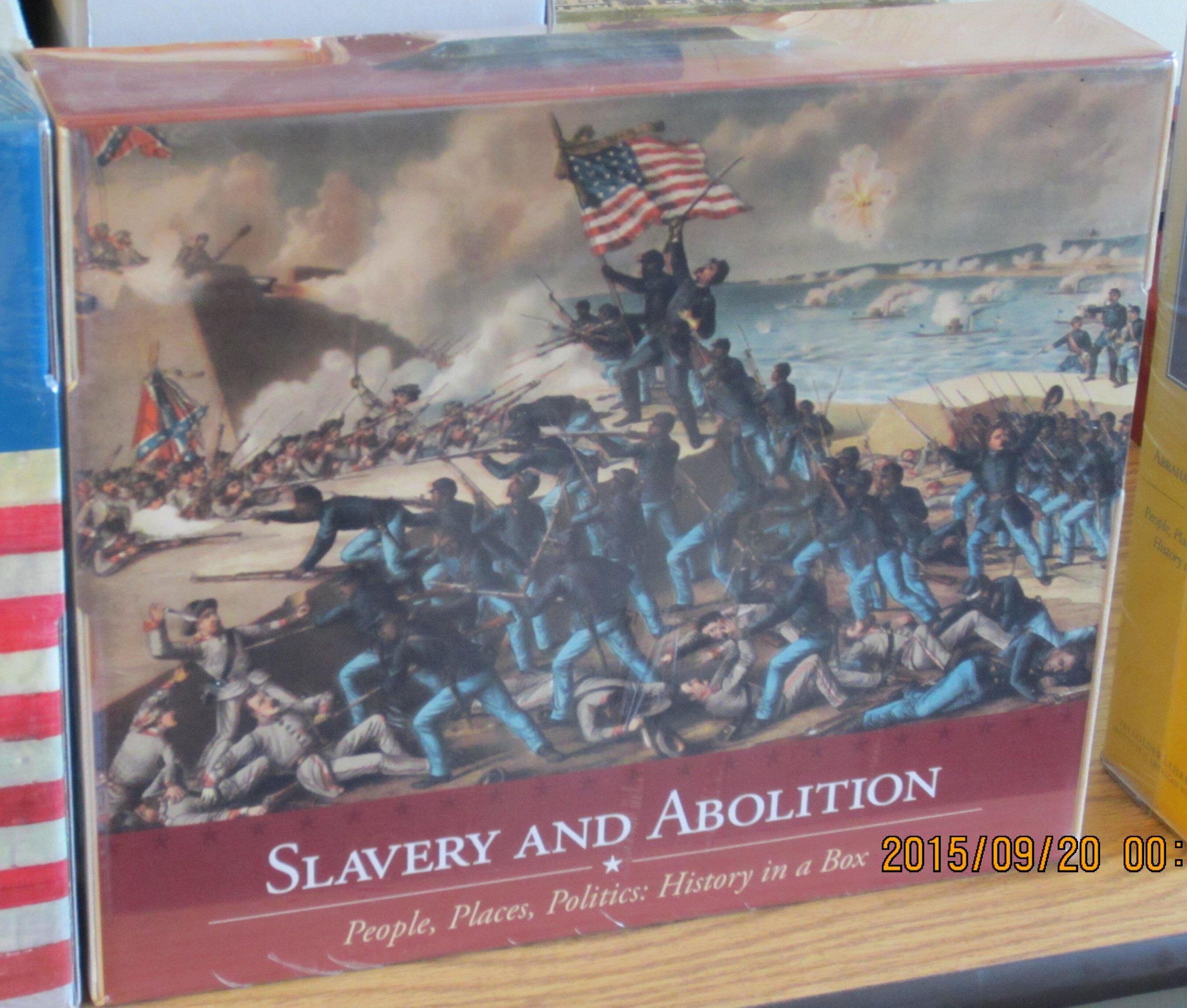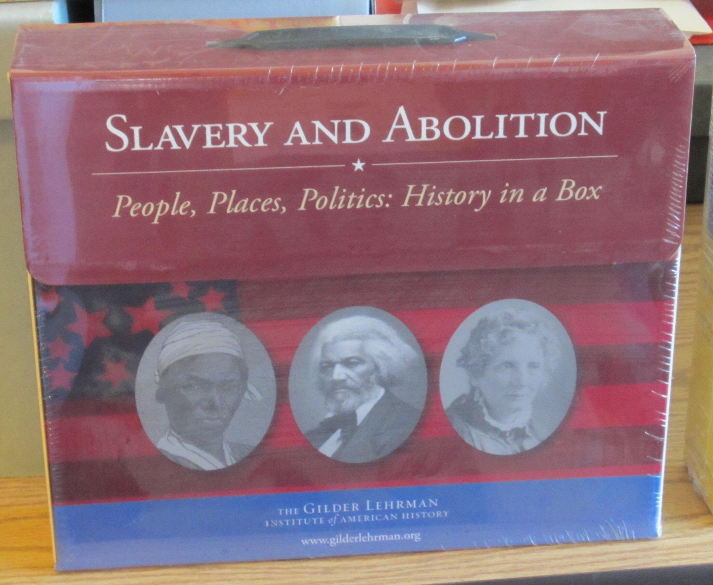 SLAVERY AND ABOLITION. Collection of multimedia materials in a "History in a Box" including: CD "Songs of Slavery and Freedom"; DVD of 8 lectures "Historians on the Record"; 35p booklet on "Citizen or Slave, the Dred Scott Decision 1857"; 24p booklet "Wilberforce, Lincoln, and the Abolition of Slavery, Sources in the History of Emancipation"; 56p "Slavery in the Founding Era"; 48p "Abraham Lincoln and the Emancipation Proclamation," a selection of documents for Teachers; 22x34" poster Timeline re slavery and abolition; ten 17x22" posters Human Cargo, Slave markets, Amistad case, Wedgwood's iconic image 'Am I not a Man', Frederick Douglas' book, runaway slave ad, The Emancipation Proclamation, 1863 recruitment poster for Men of Color, the 54th mass. Reg. storming Fort Wagner SC, 1870 celebrating the 15th Amendment; eight illustrated 8.5x11" cards with Questions for Discussion on James Forten, Nat Turner's Rebellion, Olaudah Equiano, Phyllis Wheatley, William Lloyd Garrison, Henry Box Brown, Uncle Tom's Cabin, Harriet Tubman; 162 pp Resource Book for Slavery and Abolition with CD ROM.
