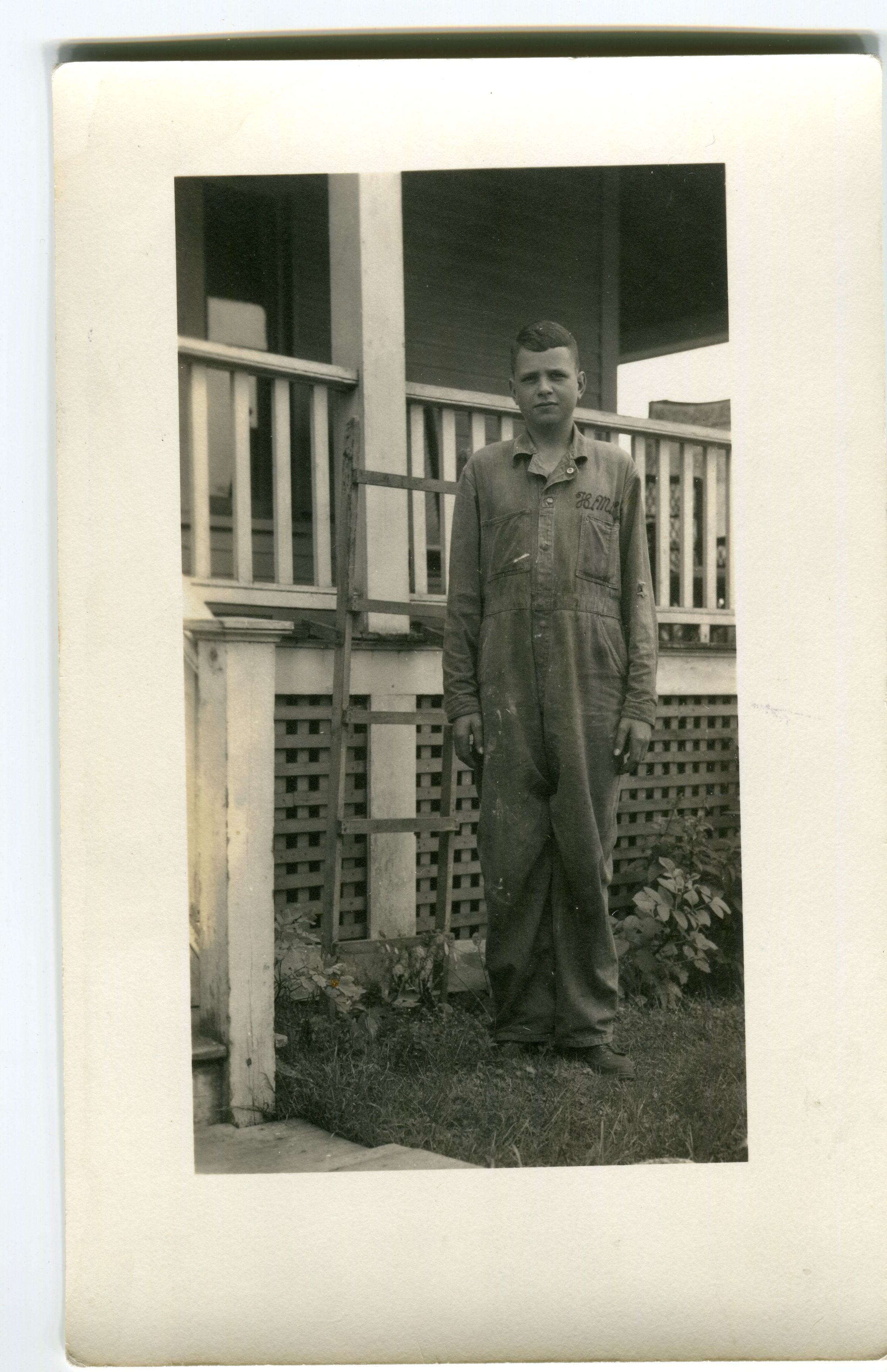 Young man in work coveralls, standing on lawn next to a porch. Partial monogram visible above his chest pocket.