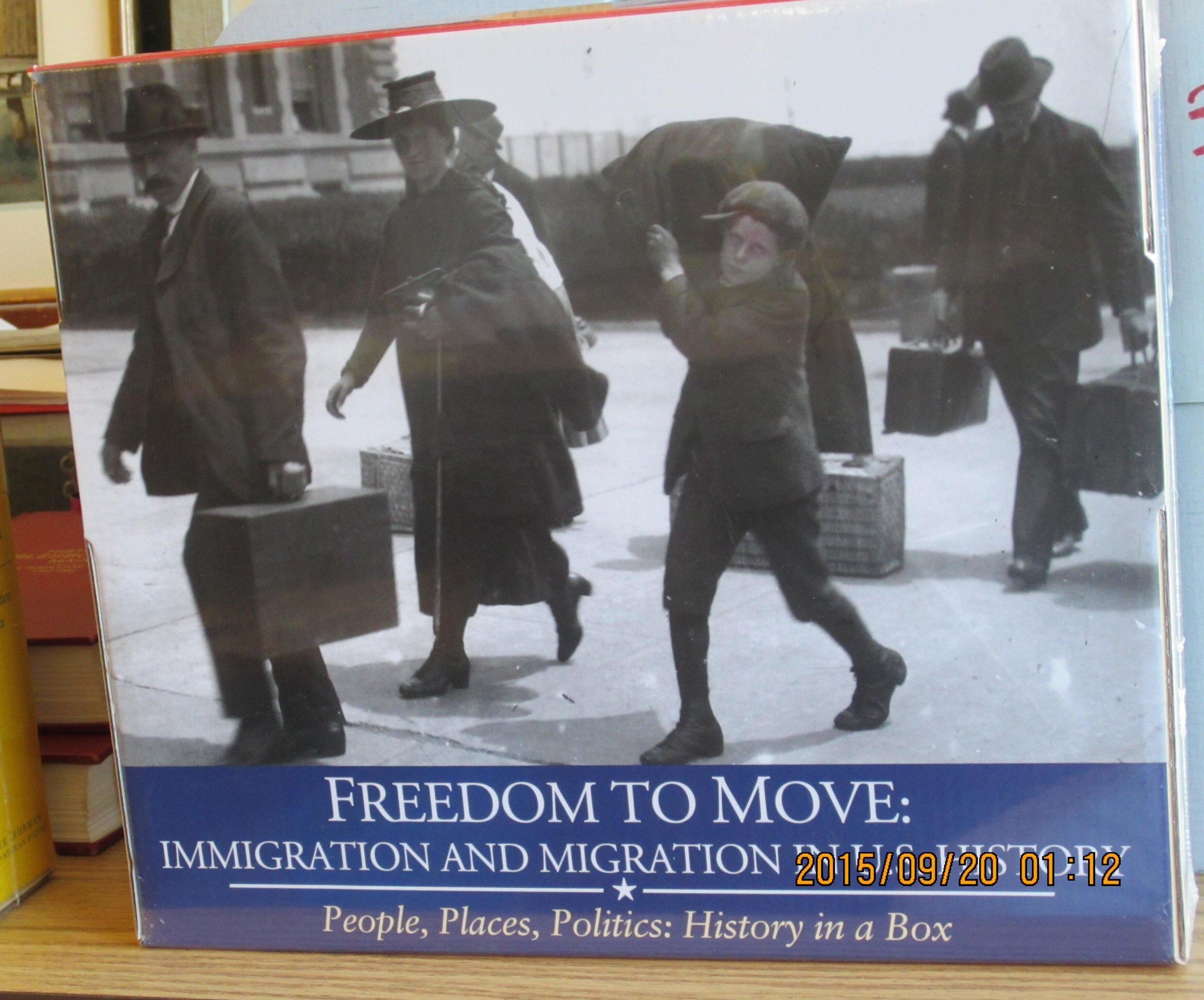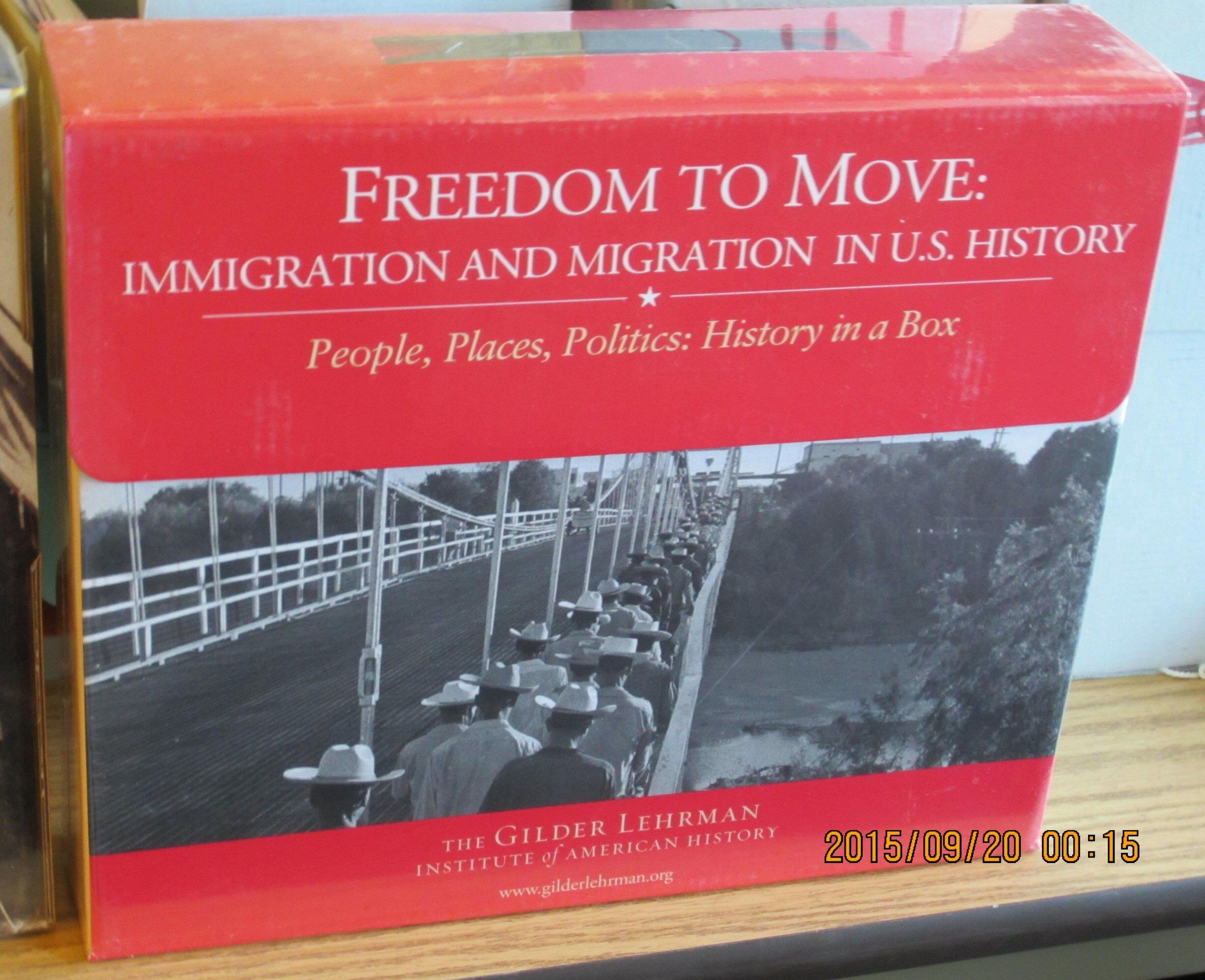 FREEDOM TO MOVE, IMMIGRATION AND MIGRATION IN U.S.HISTORY. Collection of multimedia materials in a "History in a Box" including: CD Freedom to Move - Voices of Immigration and Migration; Historians on the Record - 9 lectures on Immigration and Migration; 32p booklet 'Treasures of American History', documents presented as a tribute to new citizens; 'Freedom to Move' a 175p Resource book for teachers, not grade-level-specific and a CD-ROM printable version; 22x34" timeline poster of immigration; Ten 22x17" posters: Runaway slave, 1864 The Emigrant's Guide to Idaho, Arrival at Ellis Island 1907, Lower East Side Tenement c 1910, Asian women on ship 1925 arriving at Angel Island Immigration Station, WW1 notice of available help to All Aliens from NY Mayor's Committee on Aliens in 6 languages, 'One-Way Ticket by Langston Hughes 1949, 1942 Japanese internment noptice, Braceros crossing from Mexico to Texas c 1950s, Pres. Johnson signing the Immigration Act of 1964; Ten illustrated questions for discussion cards on Phillis Wheatley, California Gold Rush, Irish Immigration, The Chrisman Sisters 1886 homesteaders, Lakota students at Carlisle Indian Industrial School, Literacy Test, Poem inscribed at Angel Island (in Chinese) 1921-29, c1930 poem 'ElDeportado', 1939 passport for jewish immigrant, 1970s Vietnamese refugees.