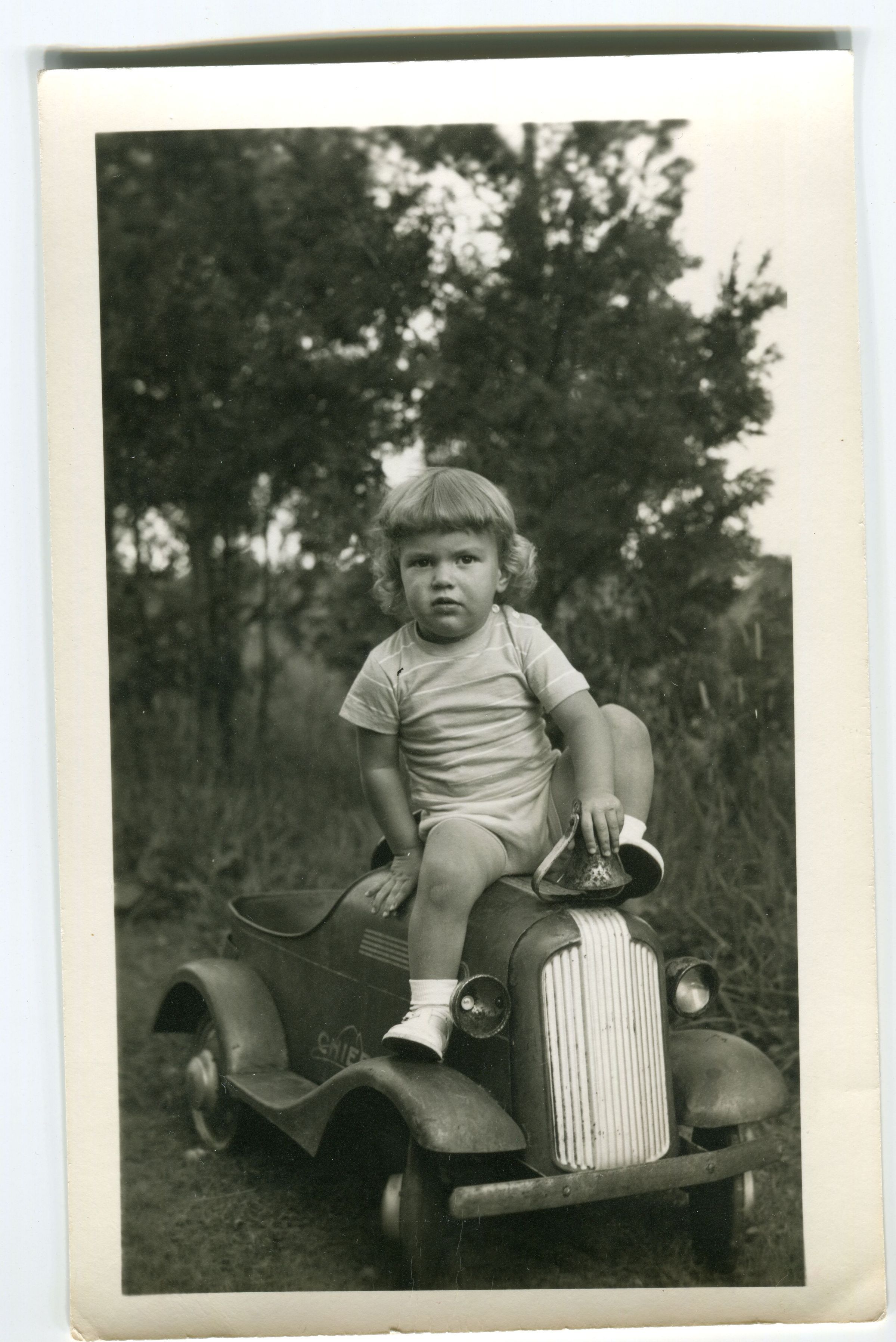 Toddler seated on a toy truck. Clothing suggest mid-20th century--striped t-shirt, shorts, white ankle socks and white shoes.