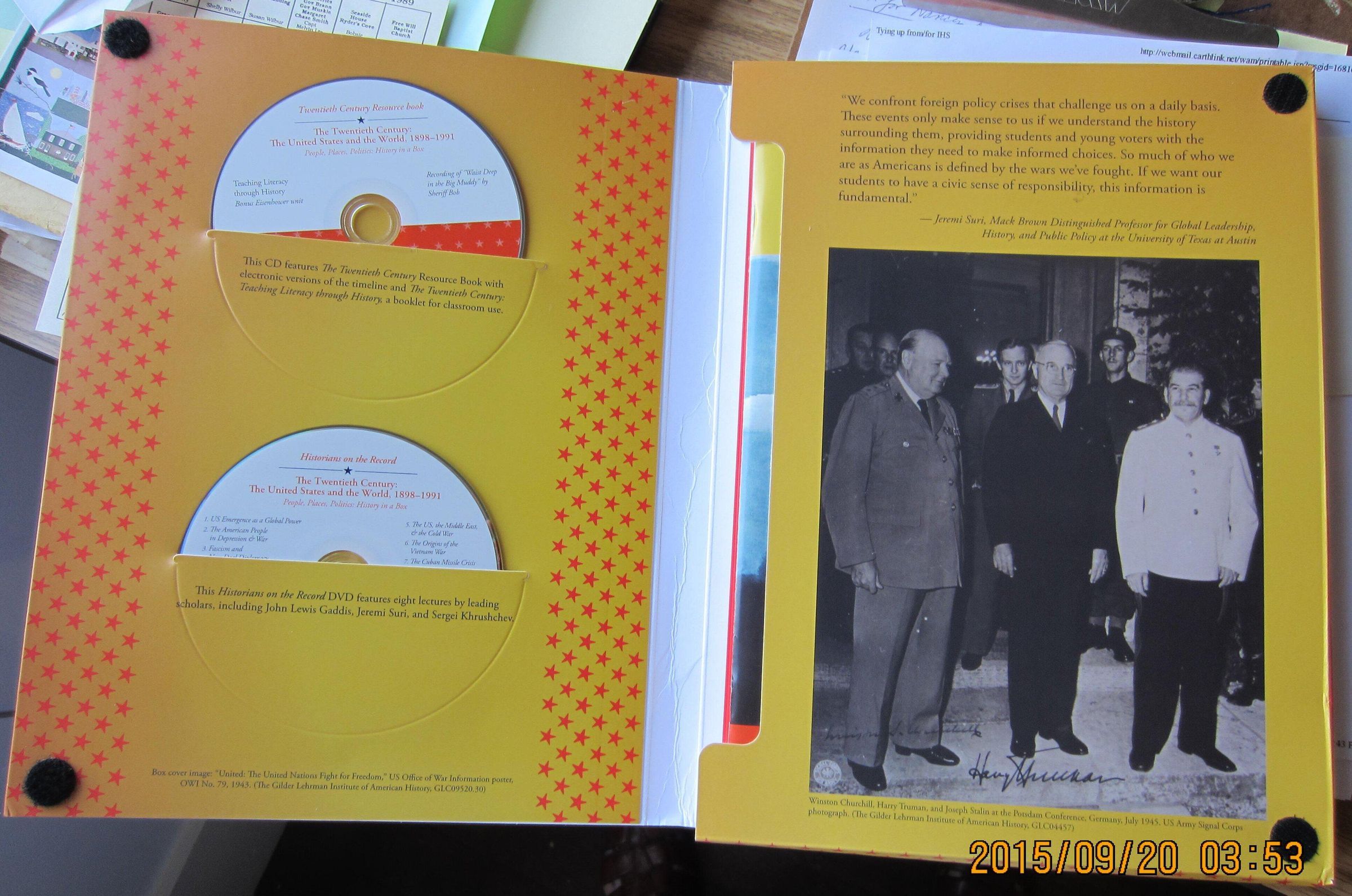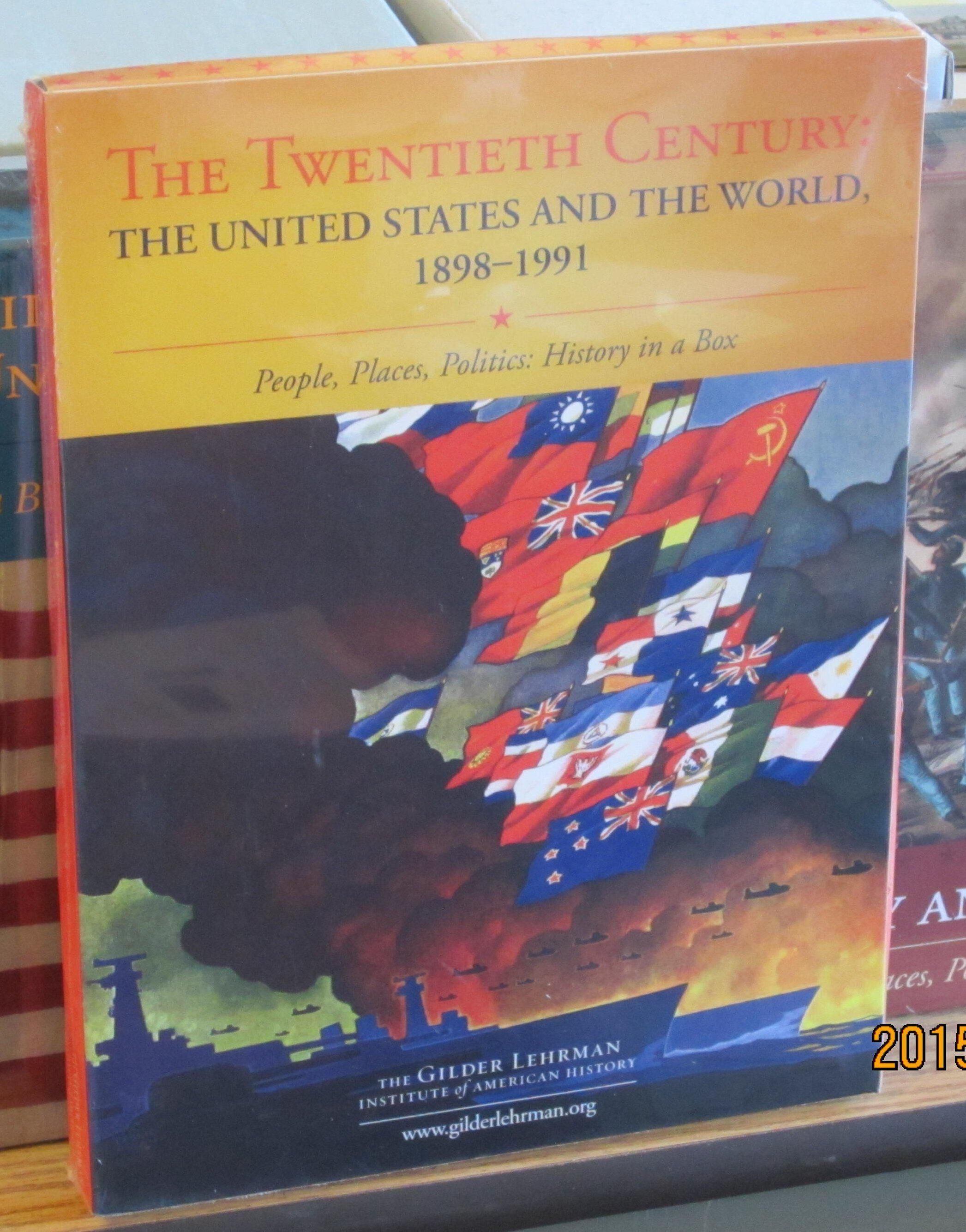 THE TWENTIETH CENTURY. THE UNITED STATES AND THE WORLD 1898-1991. Collection of multimedia material in a "History in a Box" including CD The Twentieth Century Resource Book, plus Timeline and Teaching Literacy Through History booklet; DVD of 8 lectures 'Historians on the Record"; 39 p booklet 'Teaching Literacy through History - three units aligned to the common core state standards; timeline poster 22x34" 'The United States and the World 1898-1991'; Ten posters 22x17' - Immigrants and the War Effort 1917, Labor on the Home Front 1918, 1921 World Map, 1943 Buy War Bonds illus. by Theodor Geisel, United to Fight Totalitarianism 1943, Be a Cadet Nurse 1944, Kennedy's Inaugural Address 1961, Students Protest Vietnam 1960s, Deployment of US Armed Forces 1960s, Reagan and Gorbachev at the White House 1987; Ten Questions for Discussion illustrated cards on Theodore Roosevelt 1898, WW1 Recruiting Poster 1918, Charles Lindbergh 1941, Remember Dec. 7th, First Lt Sidney Diamond 1944, Potsdam Conference 1945, Civil Rights Placard 1968 - Honor King, President Nixon Meets Mao Zedong 1972, Hostage Cartoon 1979 (dependence on foreign oil), Helping a Comrade over the Berlin Wall 1989.