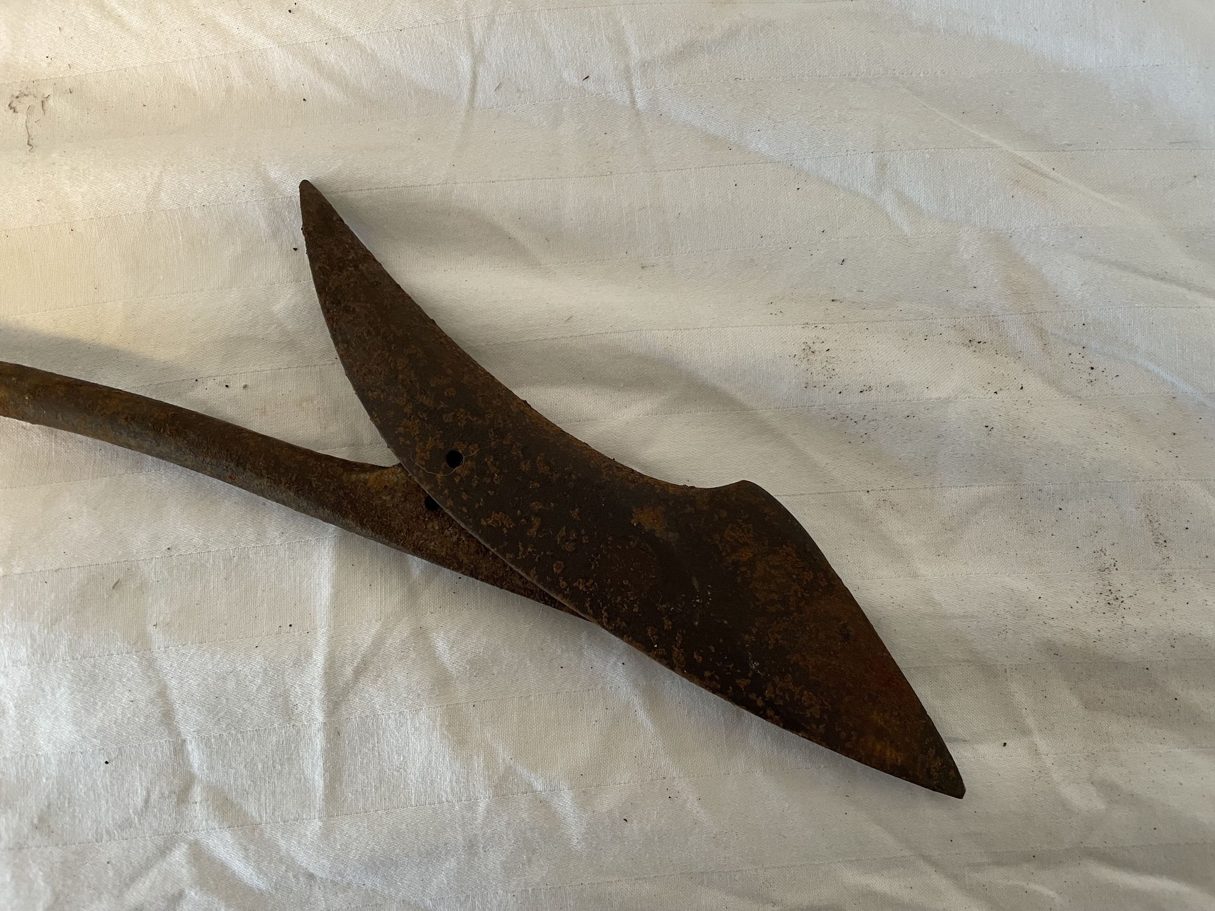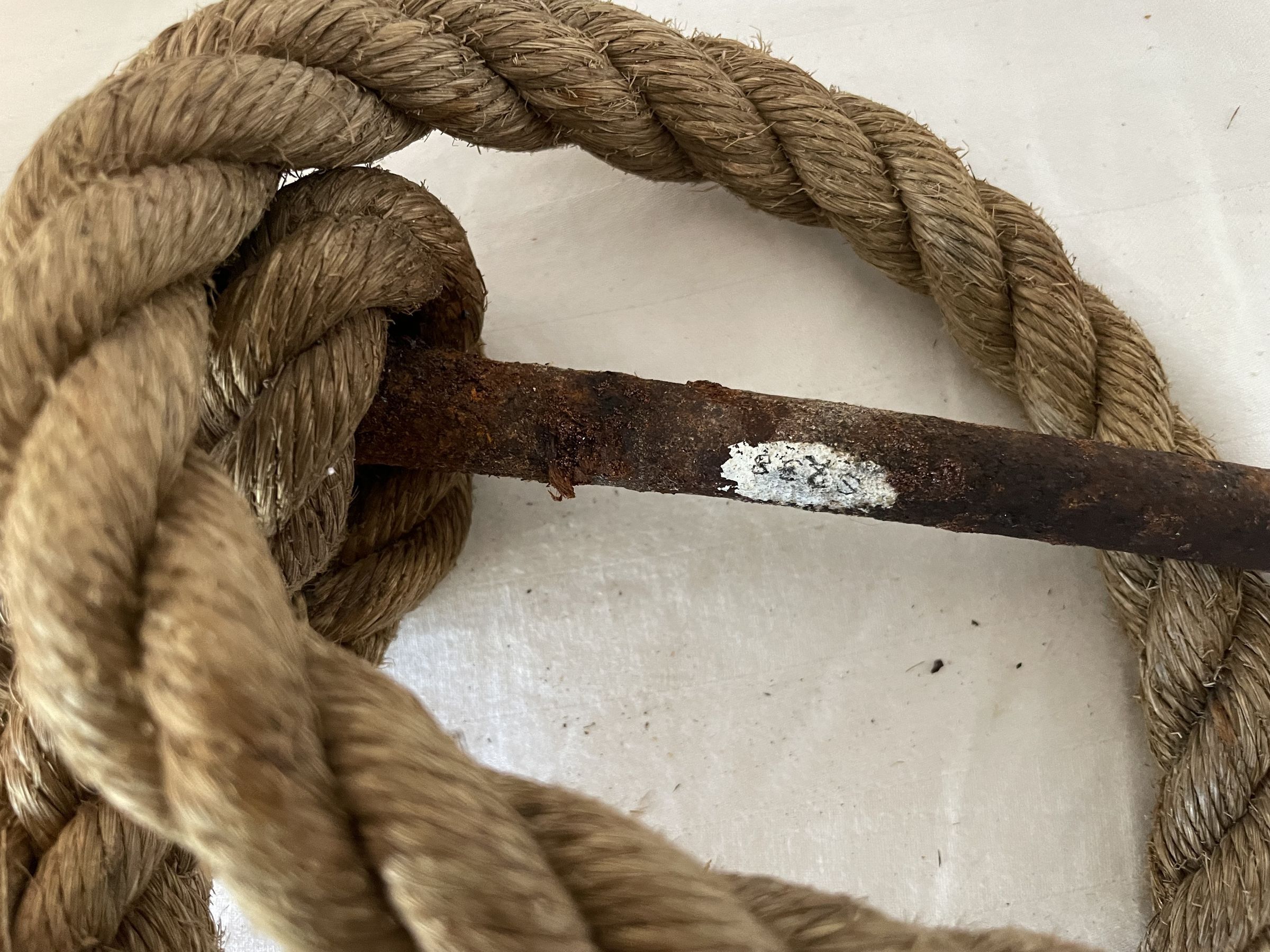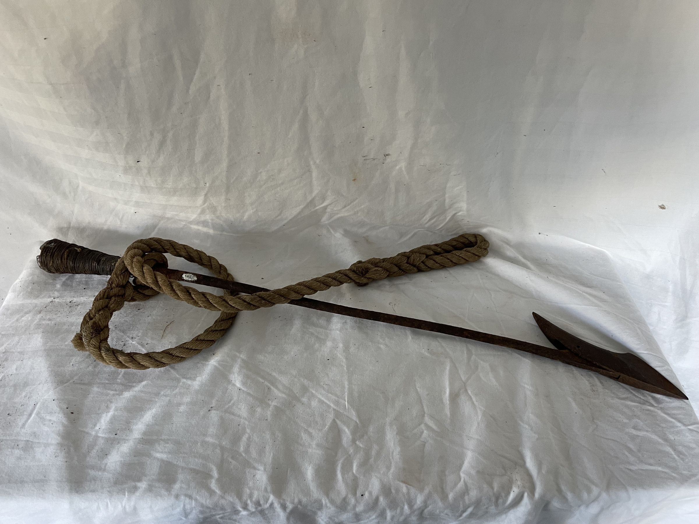 A cast iron harpoon, slightly rusted. The top blade hinges and is blunted by rust. There is an attached rope at the shaft.