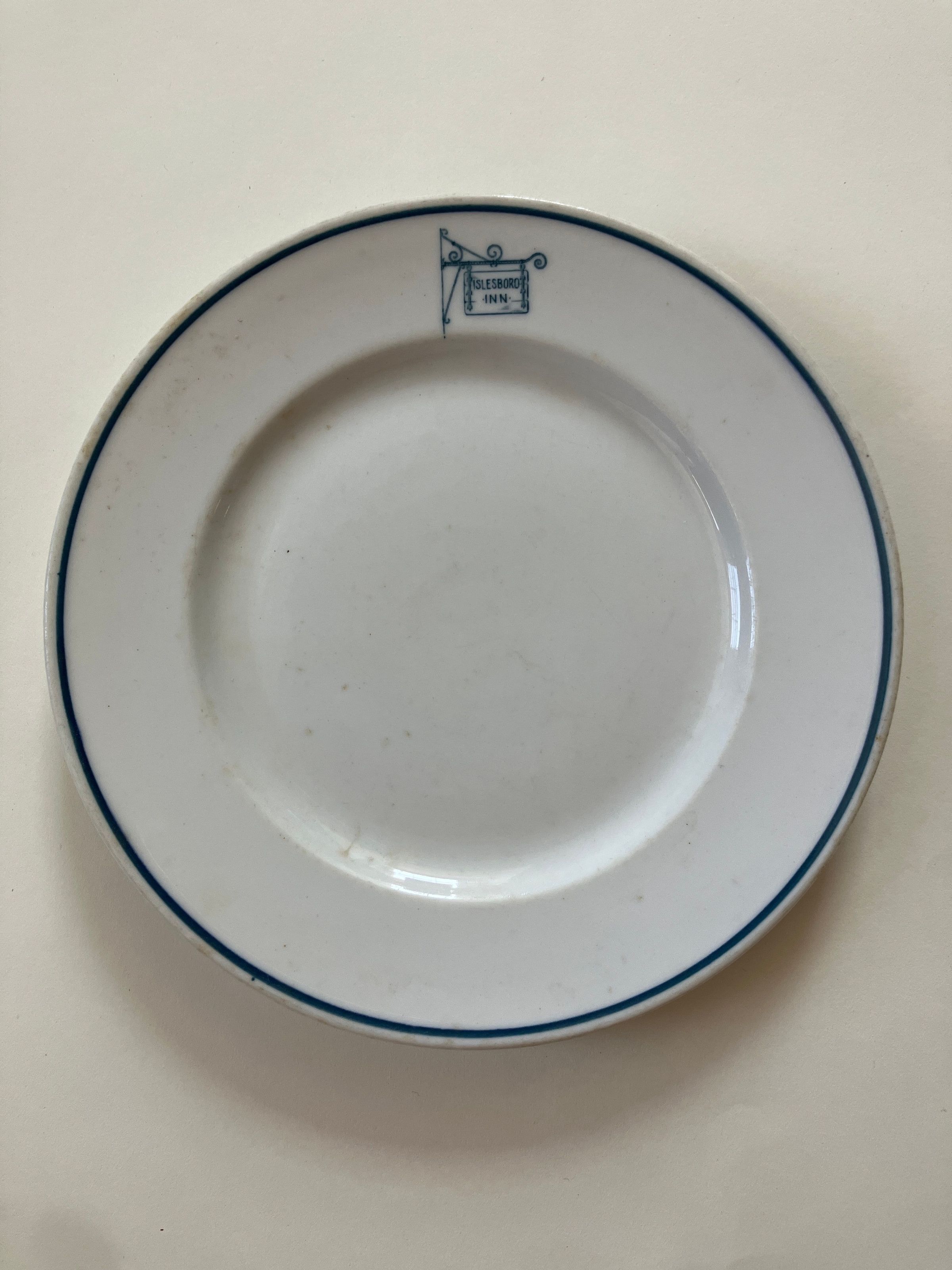 A white ceramic salad plate with blue trim. There is an insignia of a sign reading Islesboro Inn on the edge.