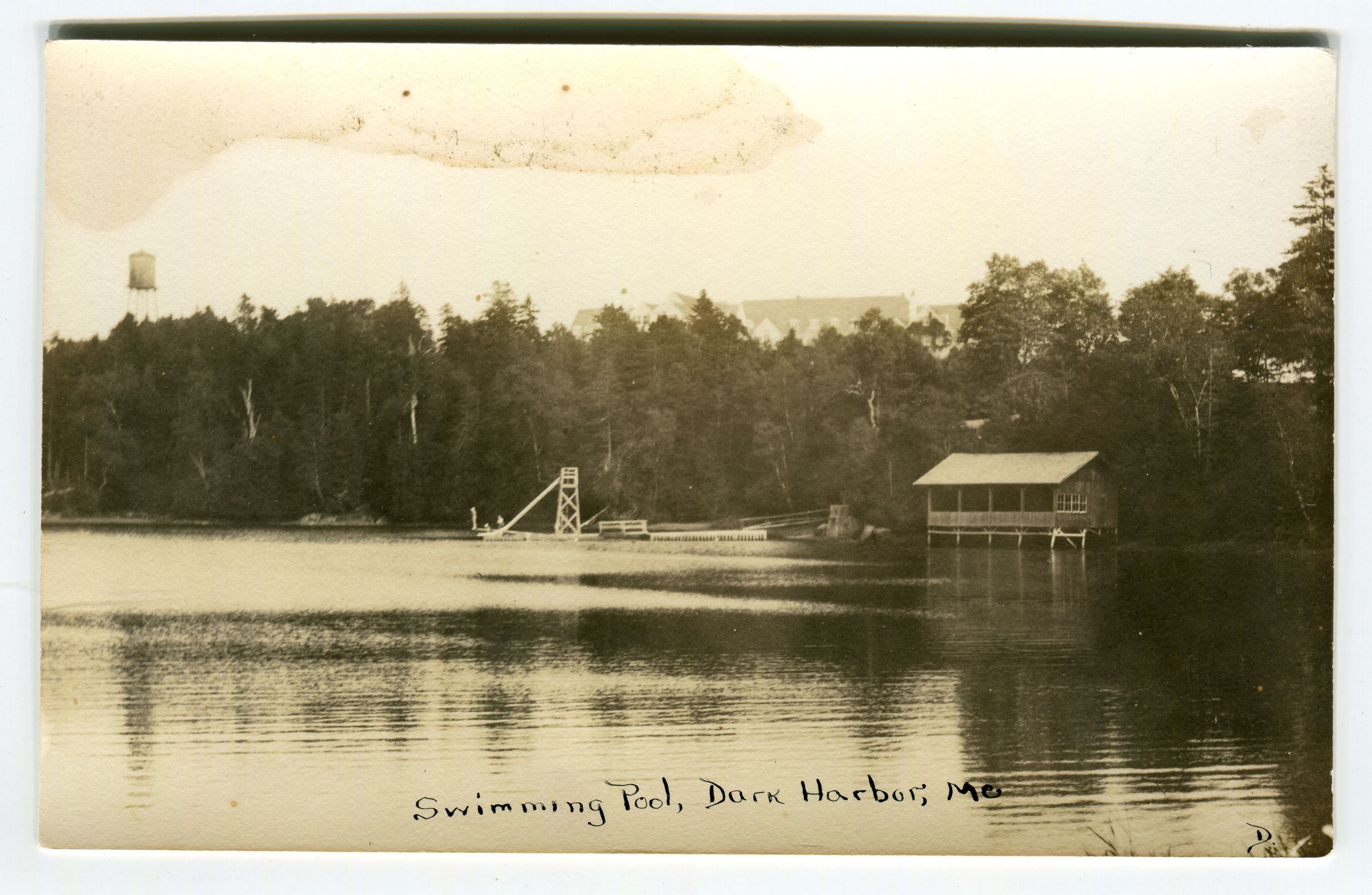 Postcard showing Dark Harbor Pool. Written on front "Swimming Pool, Dark Harbor; Me." Shows slide and boathouse. One duplicate