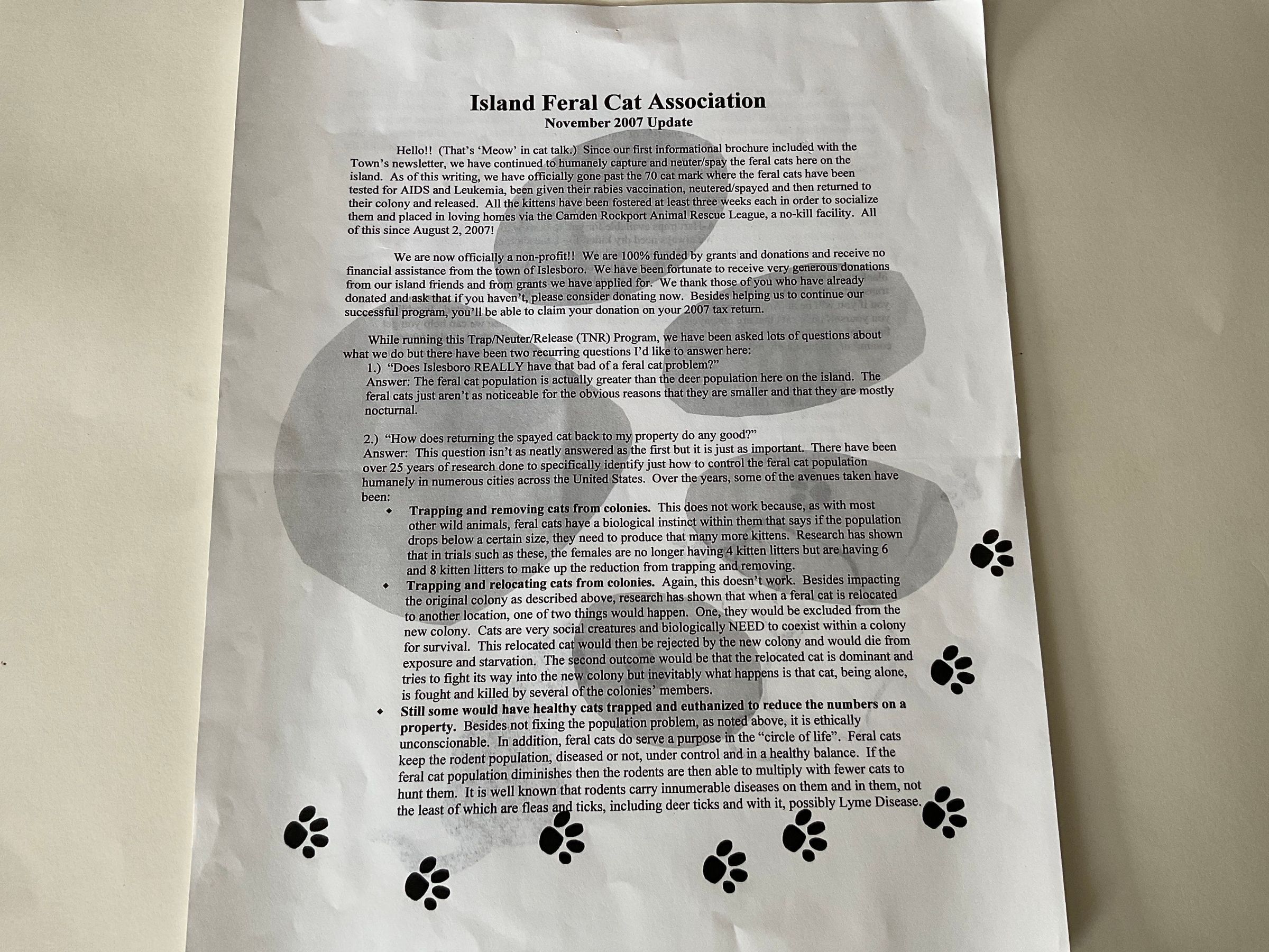 Typed newsletter update of the progress of trapping and neutering/spaying feral cats from Islesboro. More than 70 cats have been captured so far and many kittens have been placed in homes by the Camden Rockport Animal Rescue League.